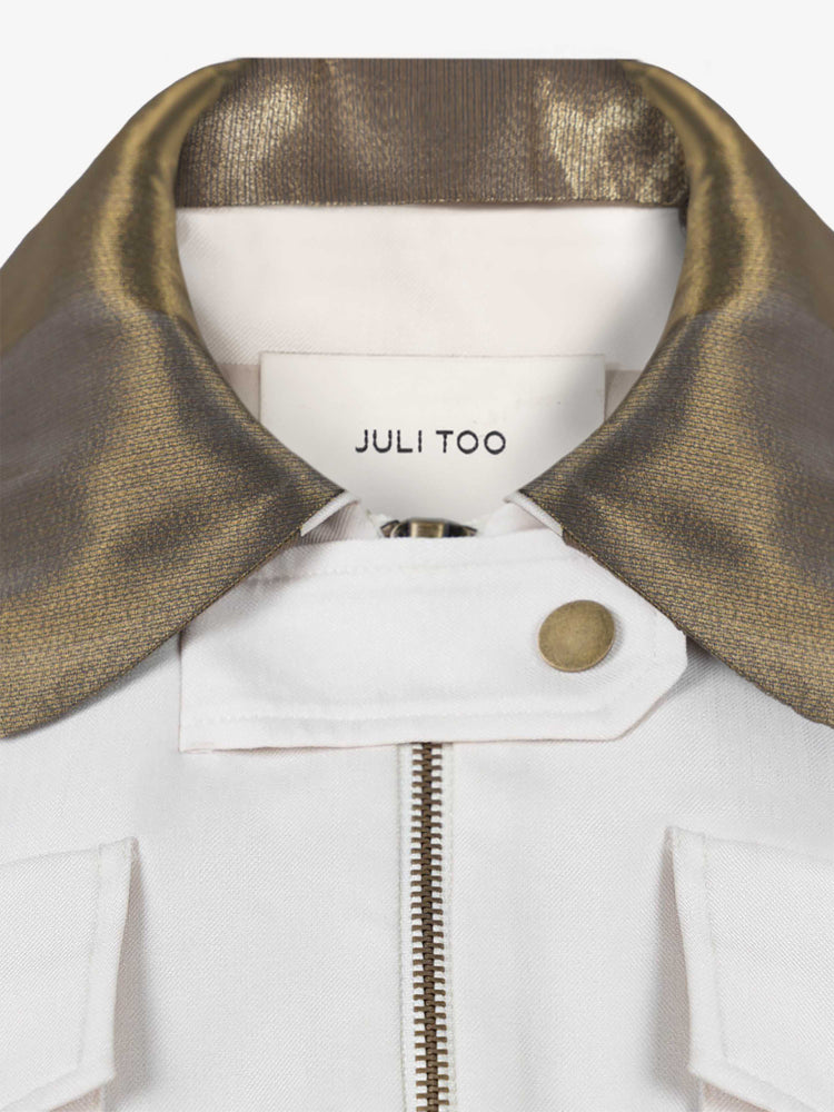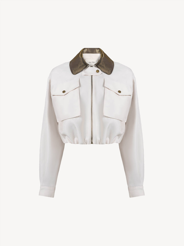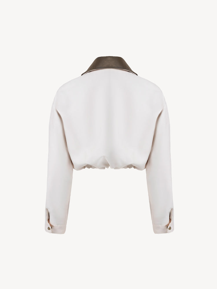 Bomber with a detachable collar, voluminous silhouette, zip-up closure.