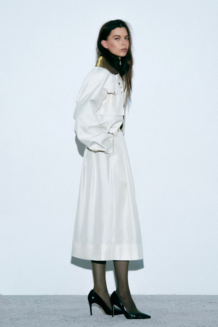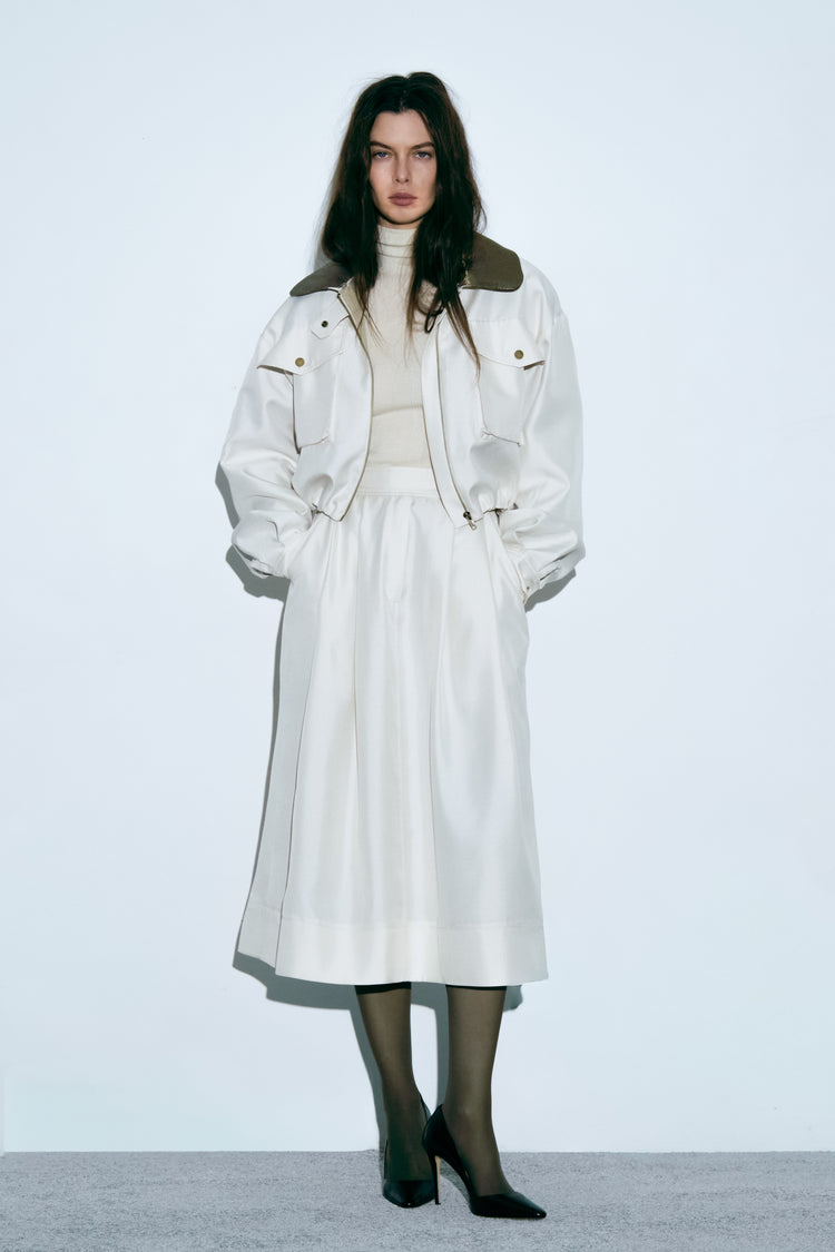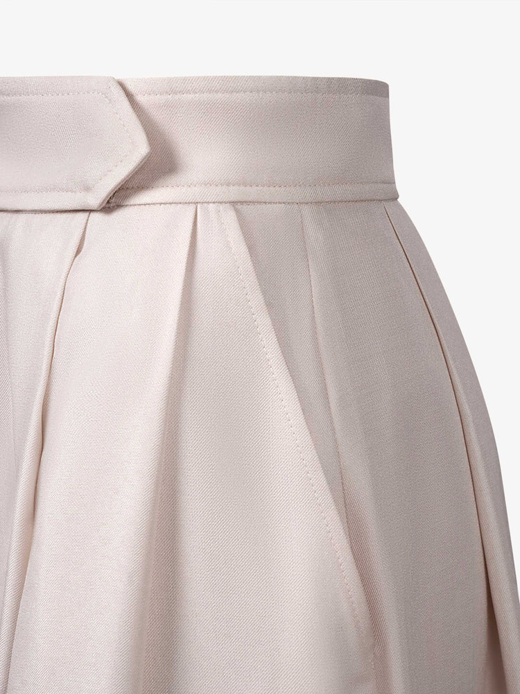 A midi-length A-line skirt with a waist fit and a zipper closure.