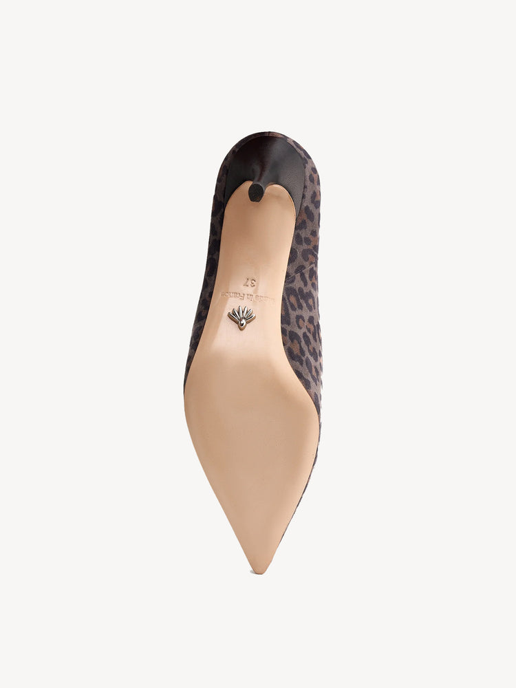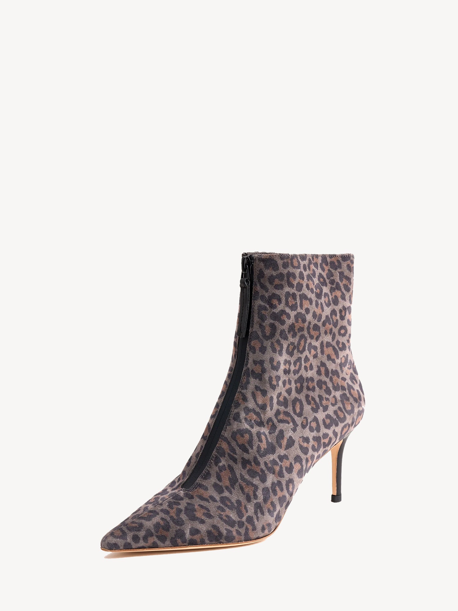 Leopard print ankle boots made of soft leather, with a pointed toe and a zipper closure