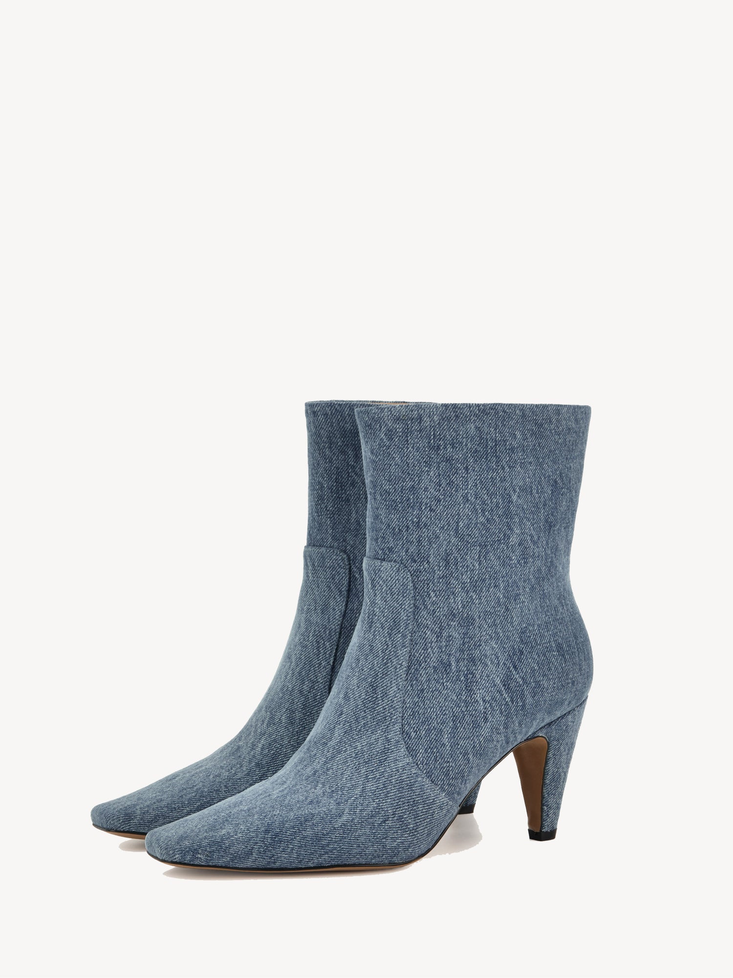 Ankle boots made of genuine leather, covered with thick denim. Pointed toe, angled heel, and a side zipper closure