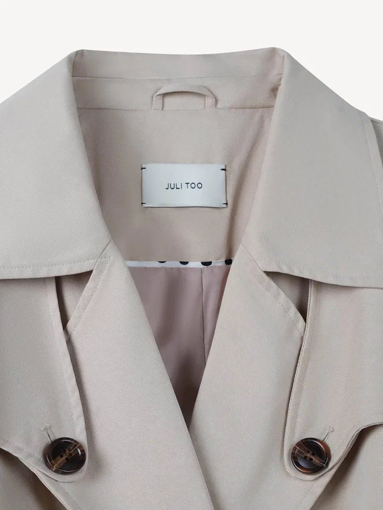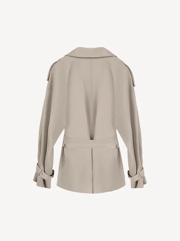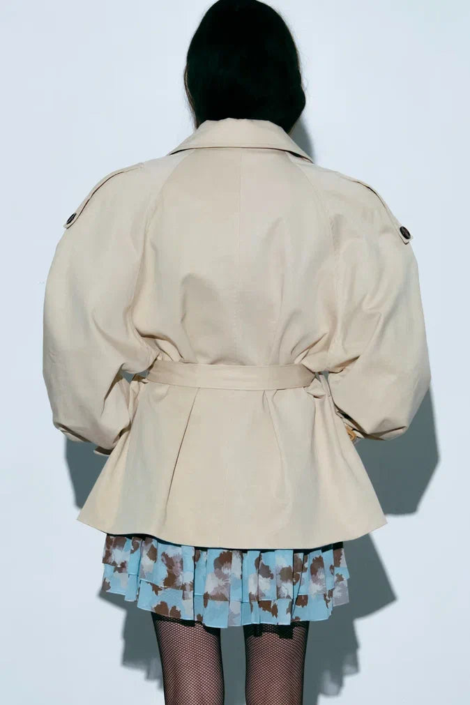 A cropped milk-colored trench coat with a double-breasted button closure and an adjustable belt. Decorative details on the sleeves and shoulders.