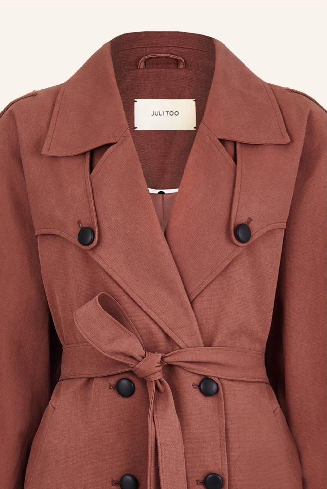 Double-breasted midi trench coat. Long sleeve. Decorative elements on the sleeves and shoulders.