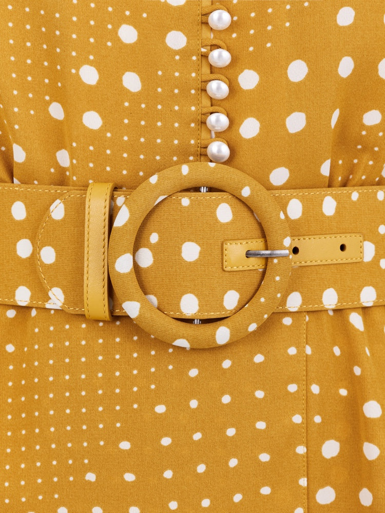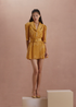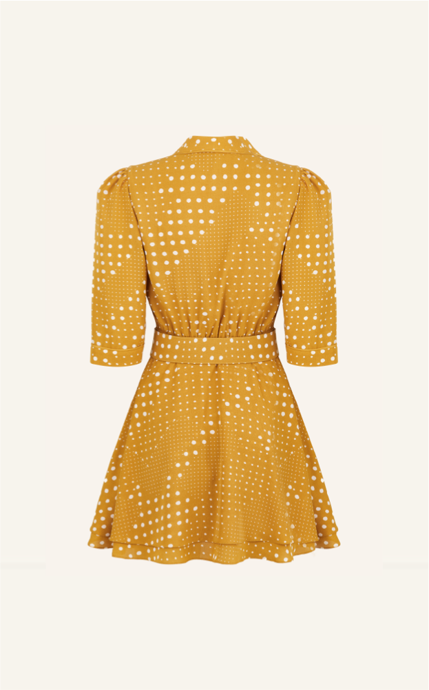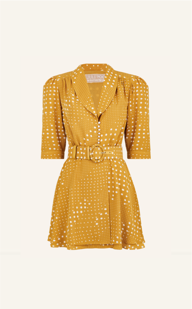 Mini dress with a wrap skirt, pearl button closure, decorative trim around the collar and cuffs, and a leather belt included