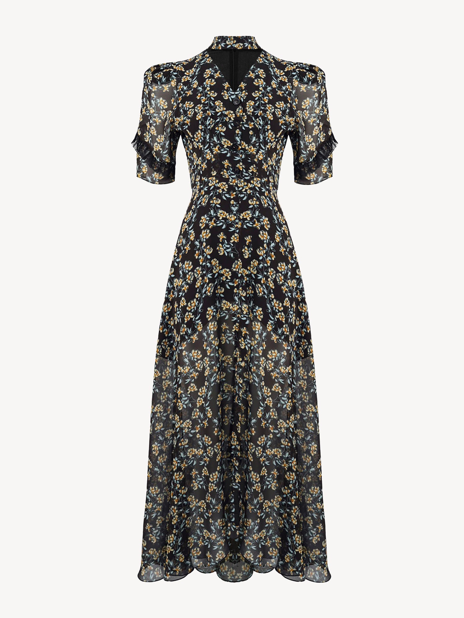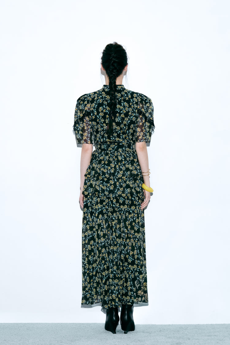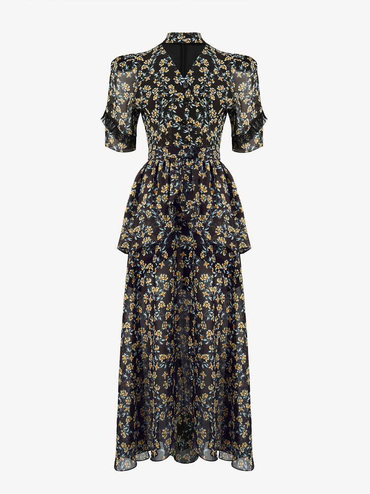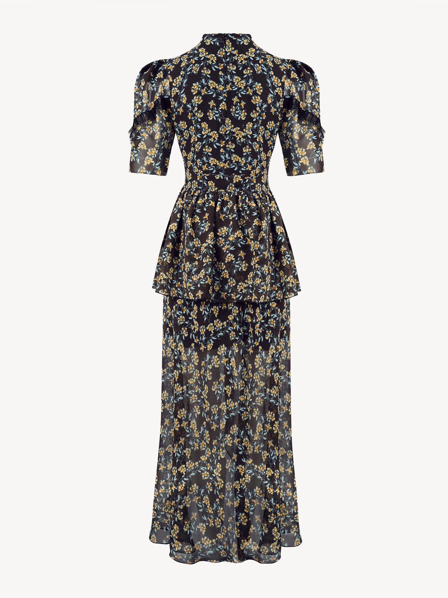 A maxi-length dress with a detachable peplum belt, decorative lace on the sleeves, and a choker.