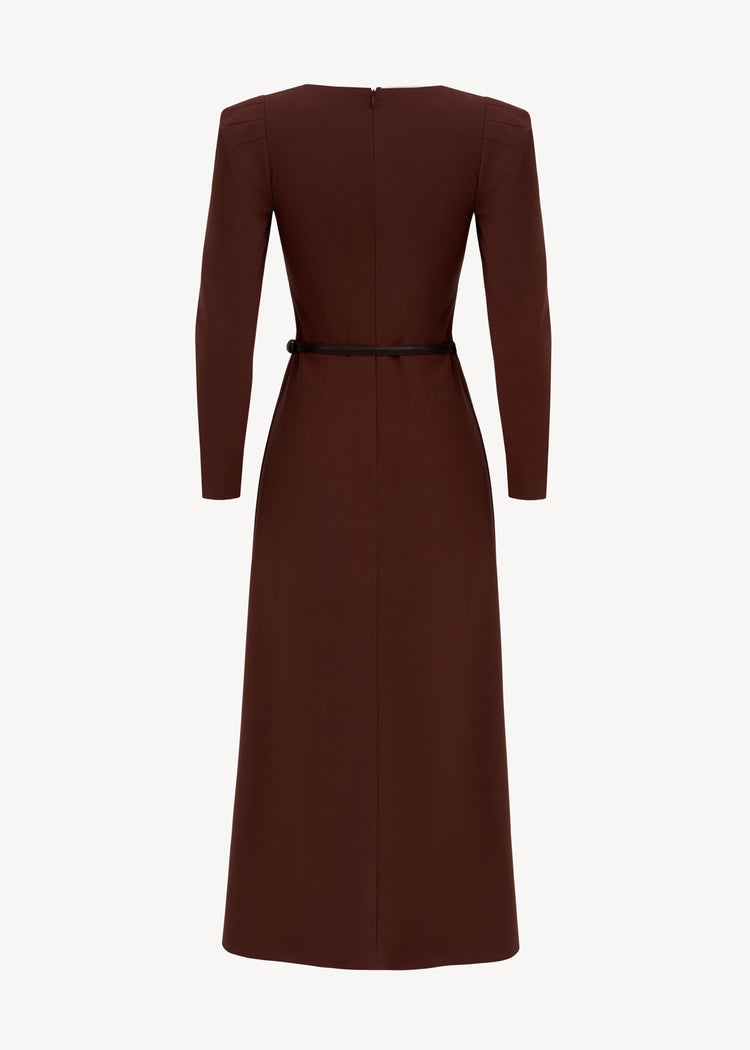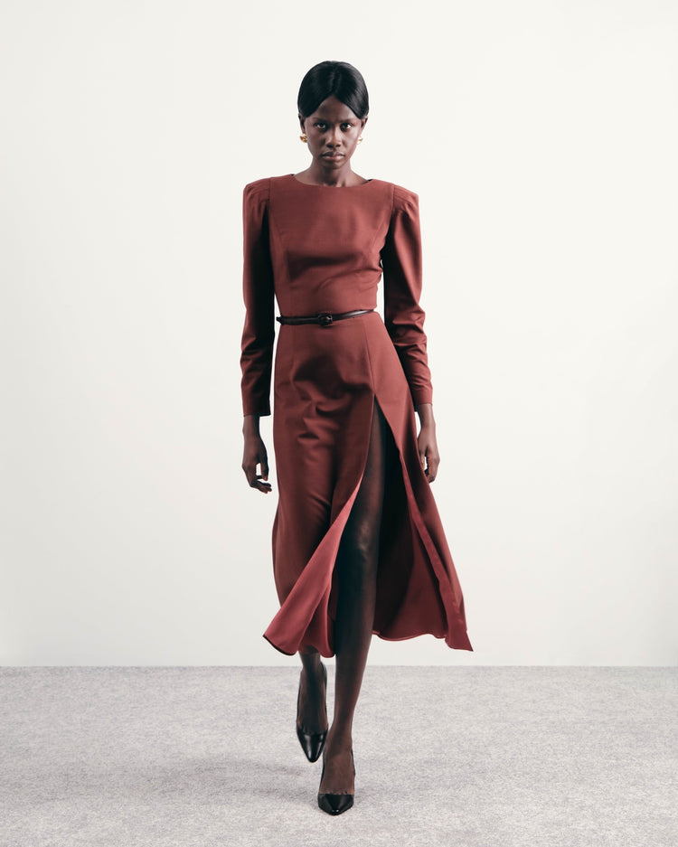 Midi dress with long sleeves, accent shoulders and a leather belt included. The fitted silhouette is complemented by a skirt with a high slit and contrasting lining.