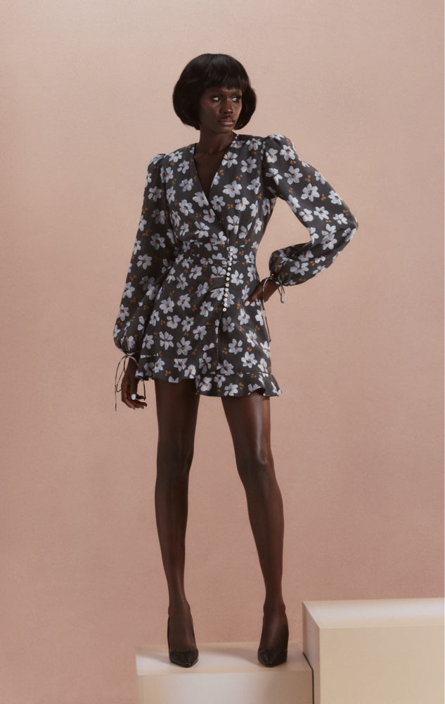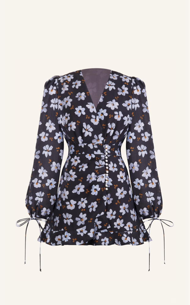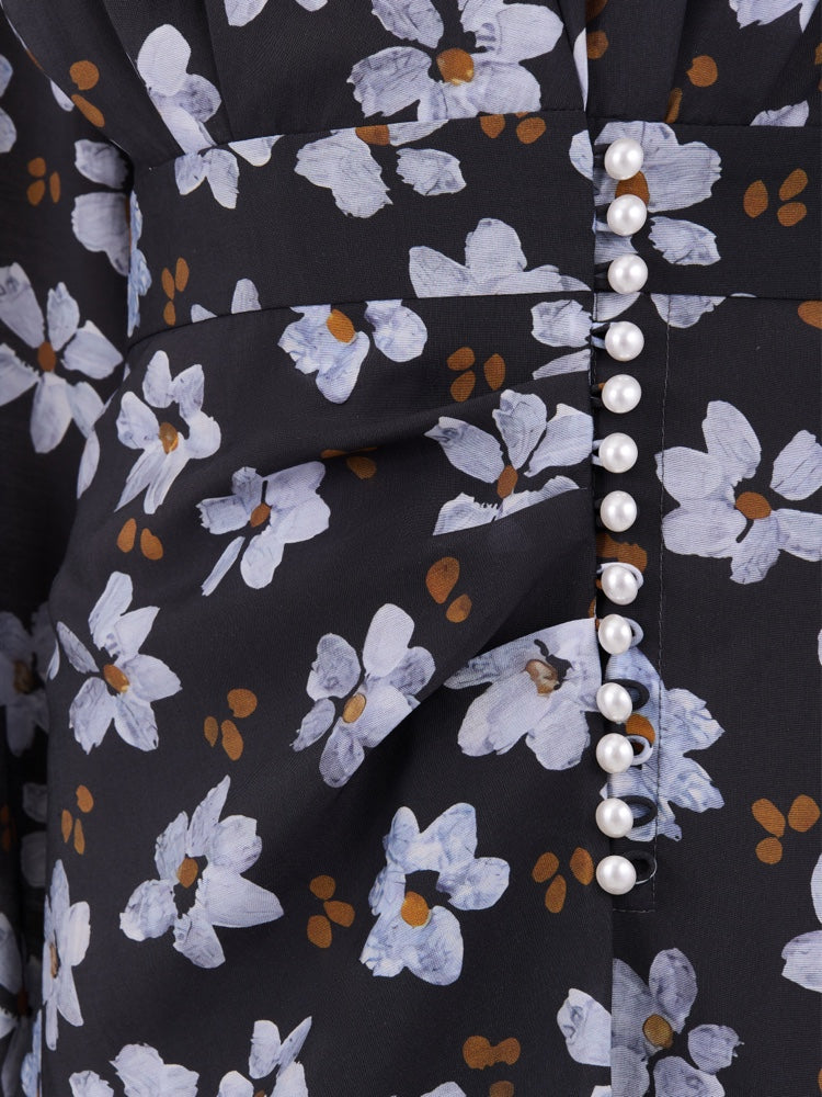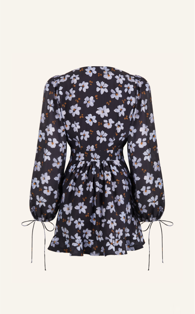 Silk mini dress with voluminous sleeves and a pearl button closure
