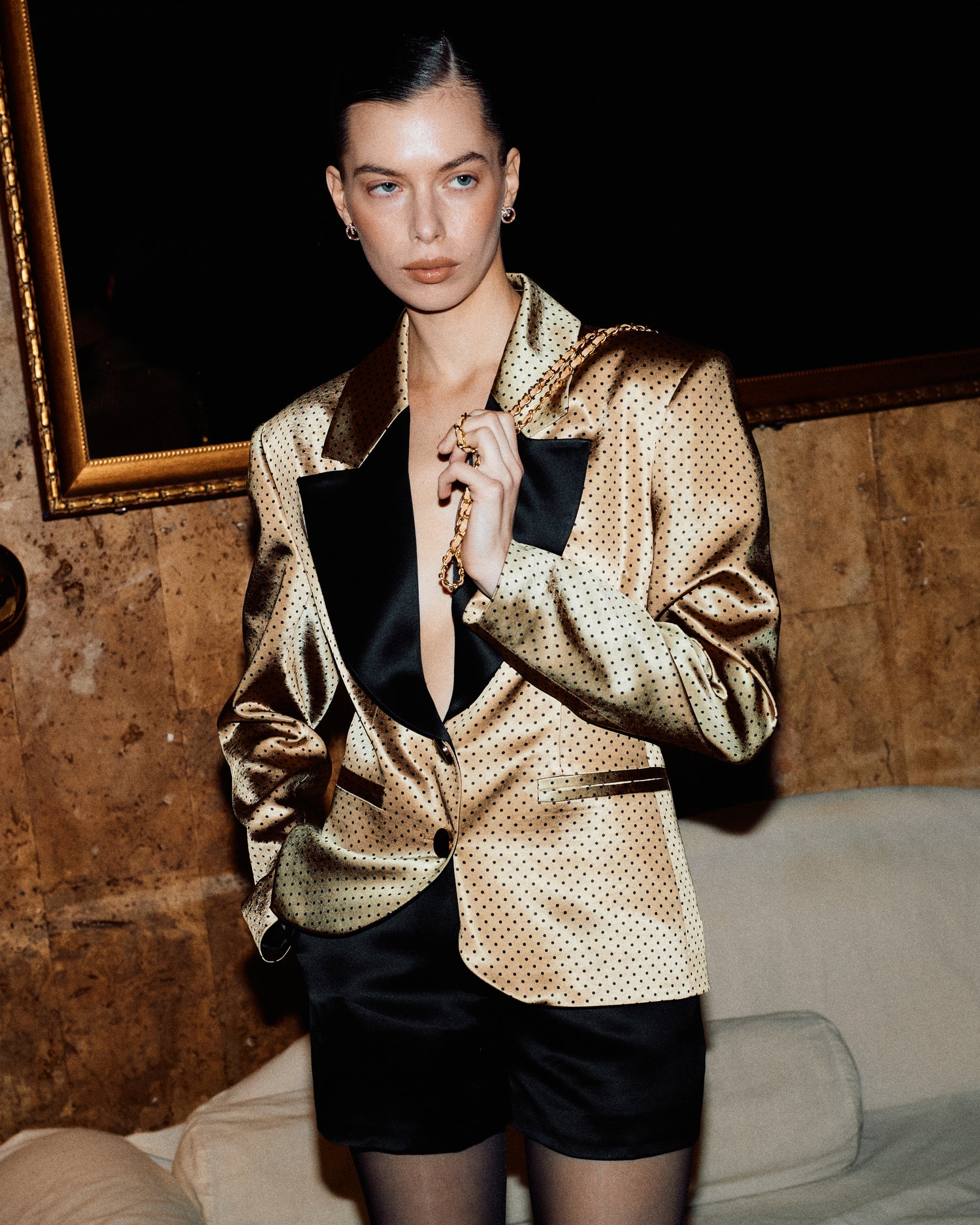 A fitted Japanese silk jacket with contrasting lapels and voluminous shoulders.