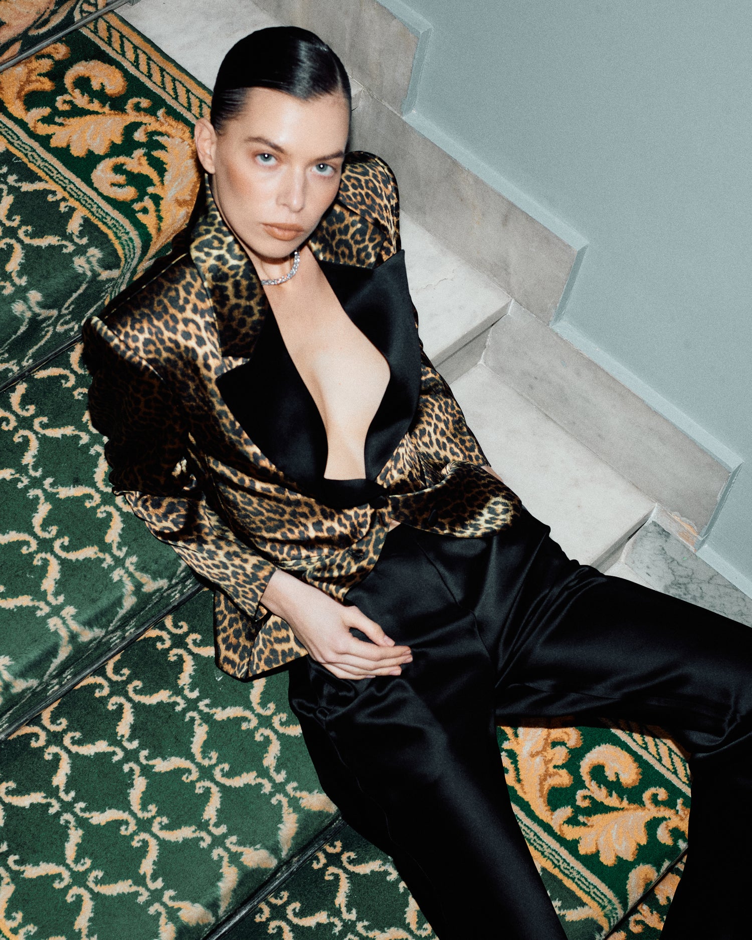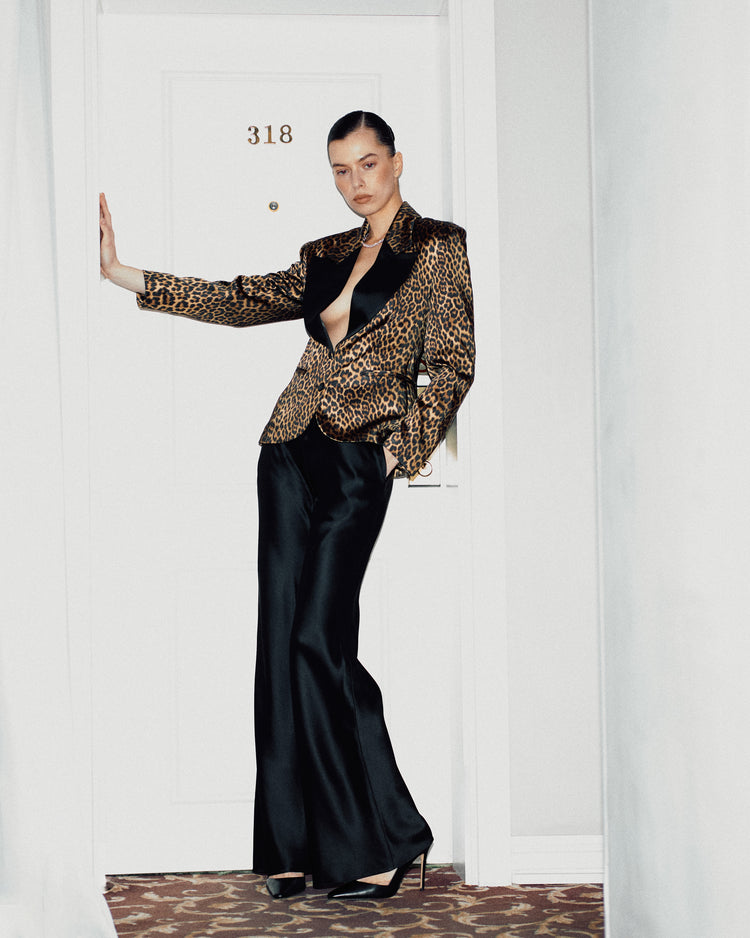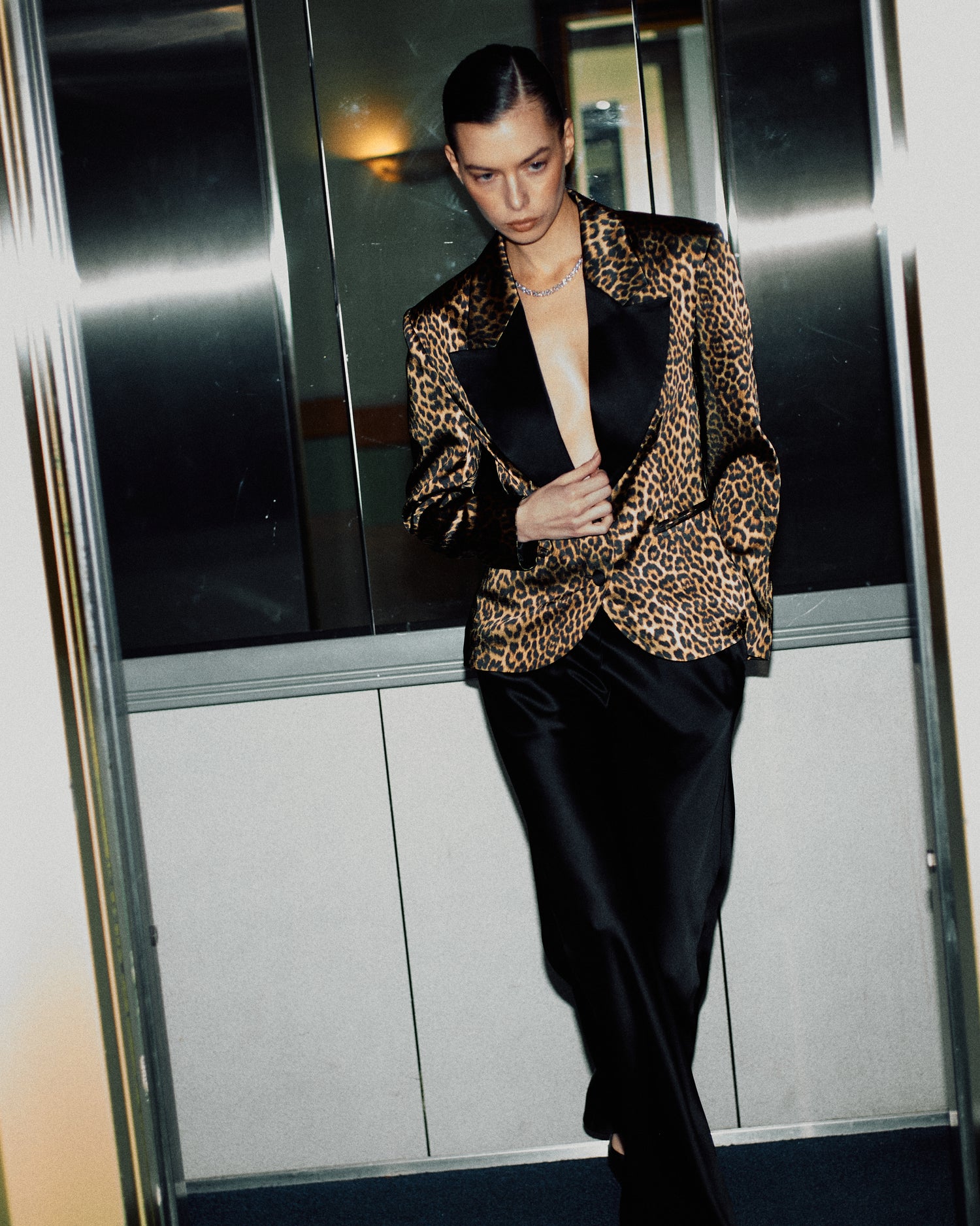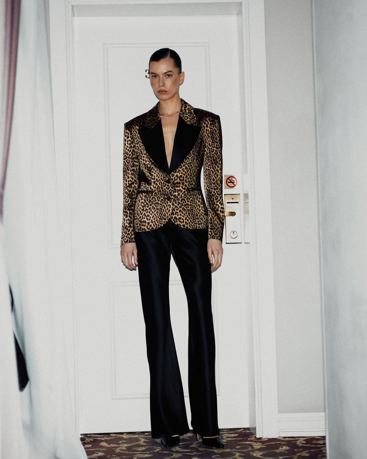 A fitted Japanese silk jacket with contrasting lapels and voluminous shoulders.
