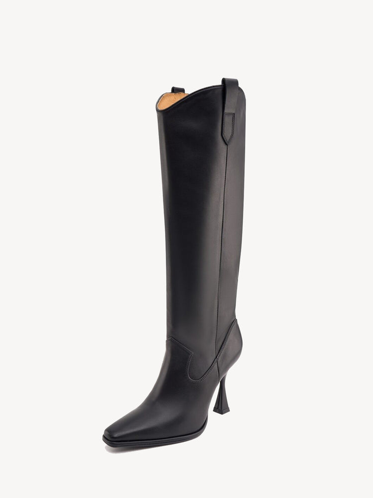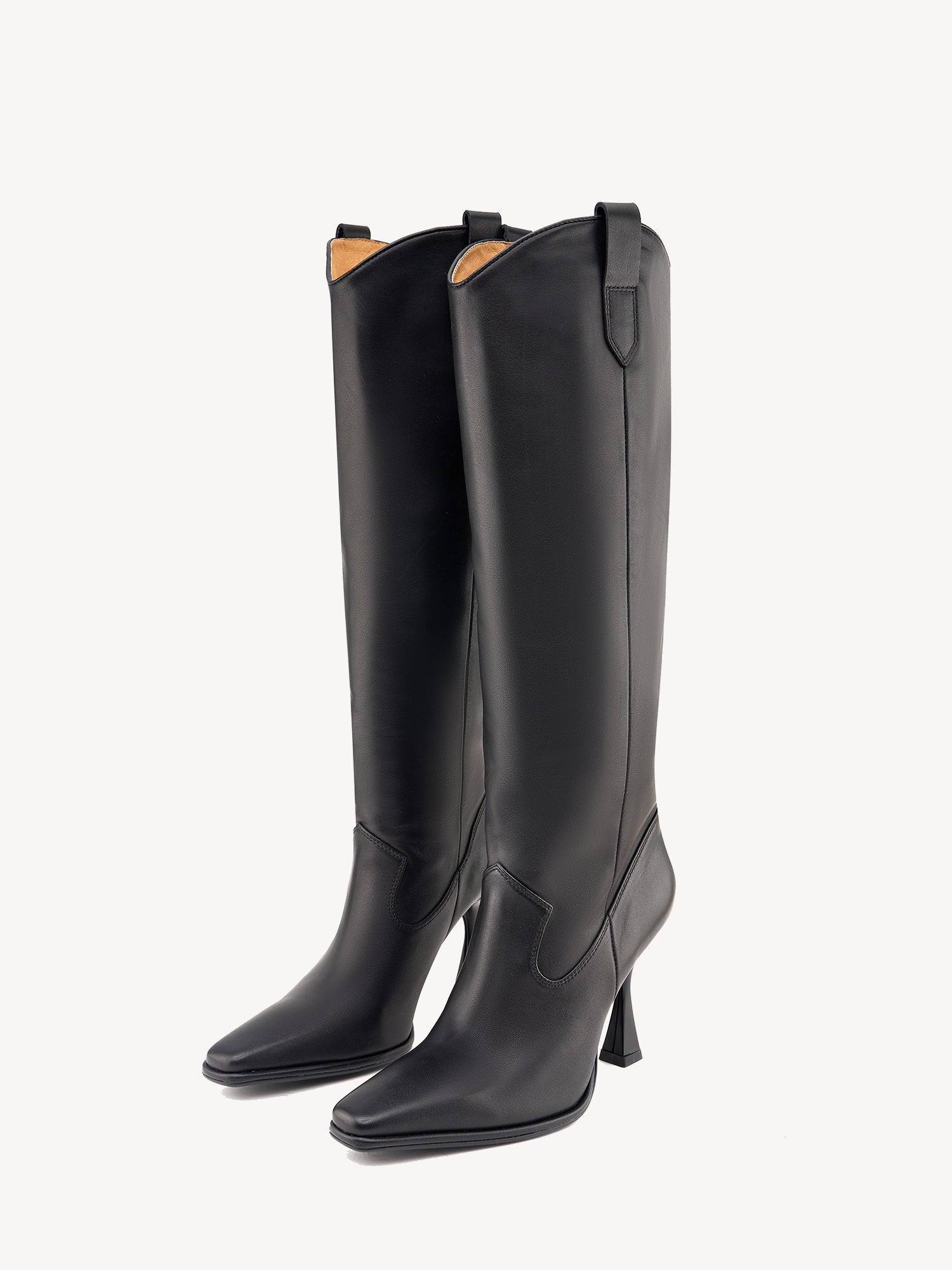 Sleek knee-length boots with a pointed toe and sculpted heel