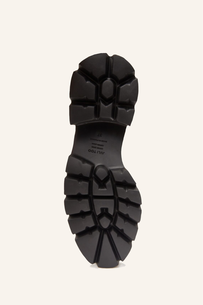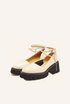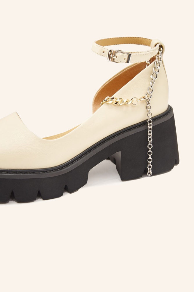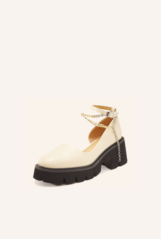 Shoes with a massive sole with a functional strap and a decorative removable chain.