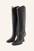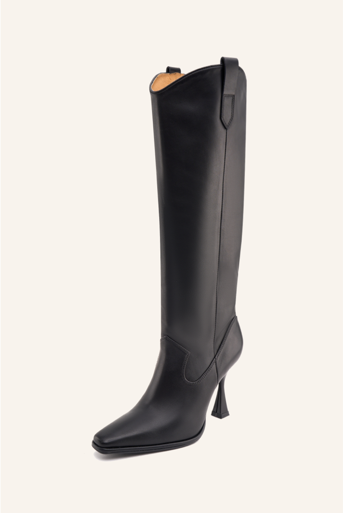 Sleek knee-length boots with a pointed toe and sculpted heel