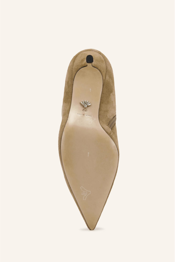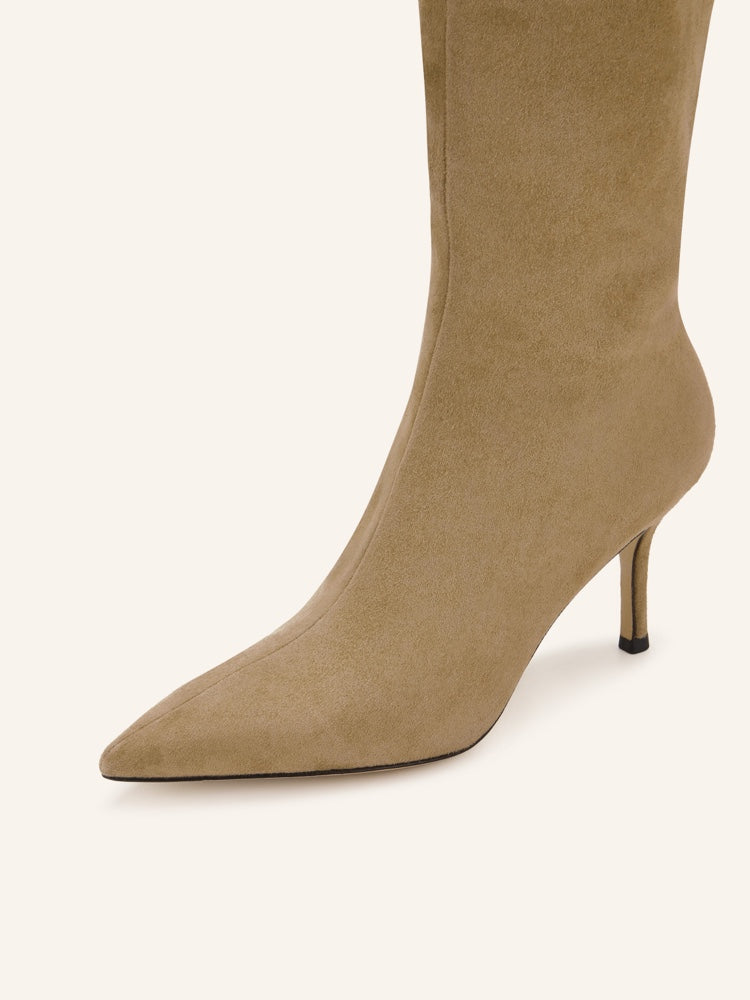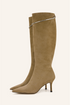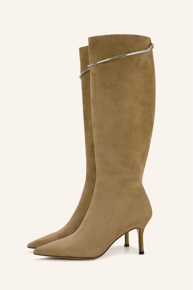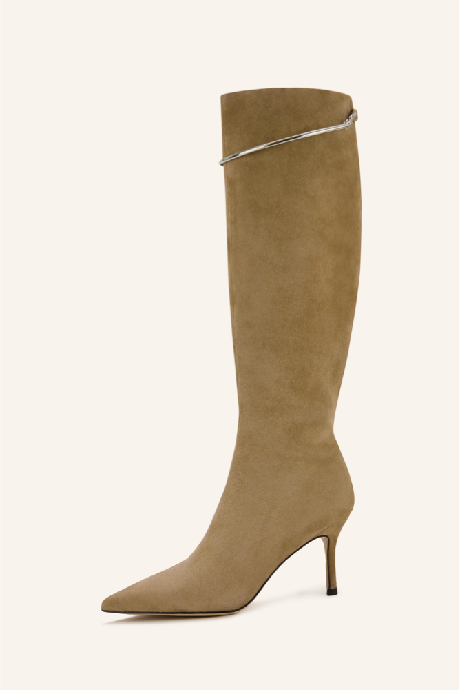 Suede knee-length boots with a pointed toe, featuring a removable metal accessory that wraps around the upper part of the shaft, and a side zipper closure
