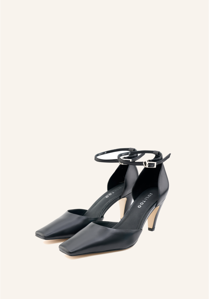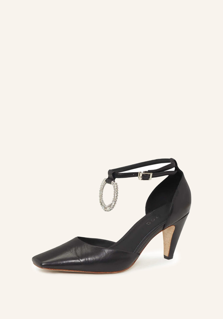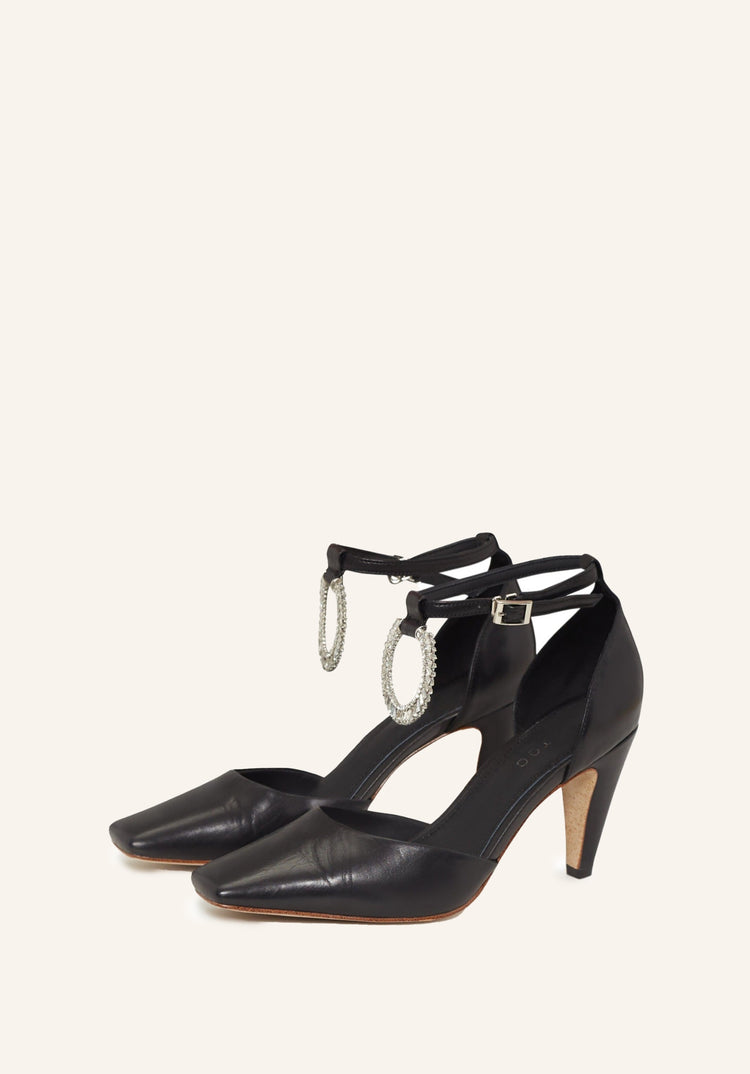 Low-heeled shoes with a square toe, ankle strap featuring a removable accessory adorned with Swarovski crystals