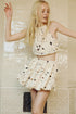 A viscose suit consisting of two elements: a mini skirt with flounces and a top with an elastic band with ties at the back.