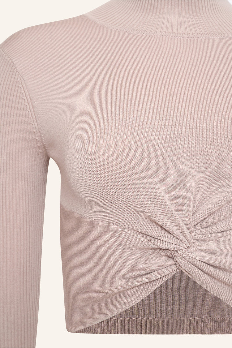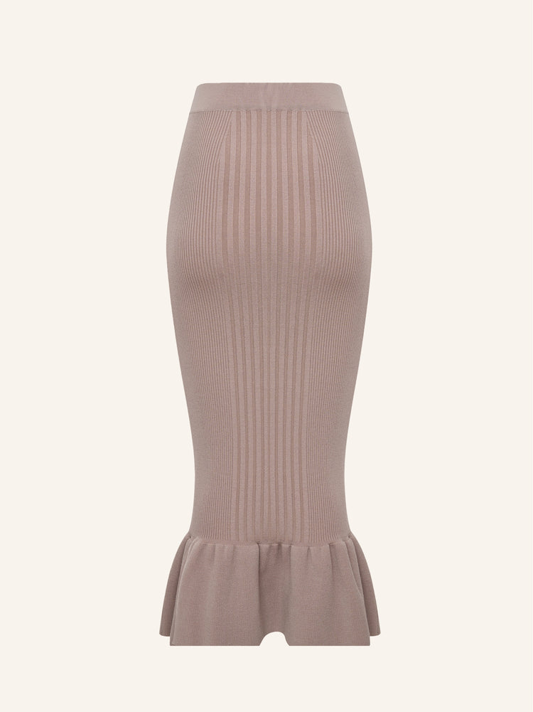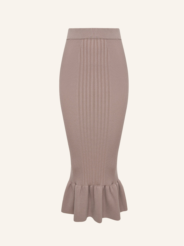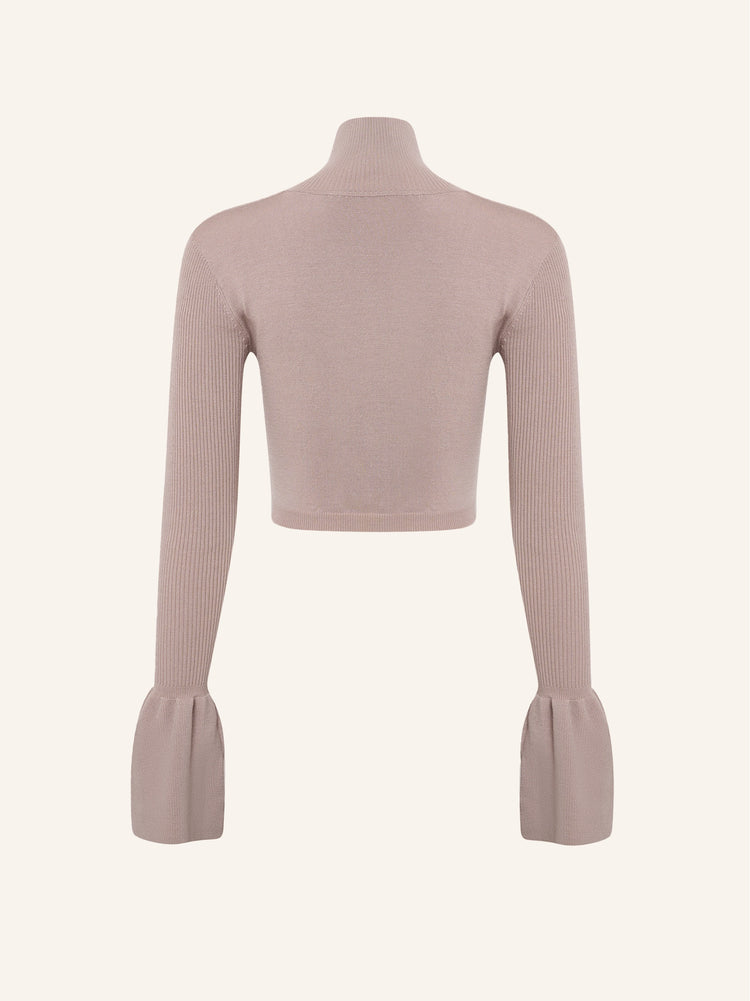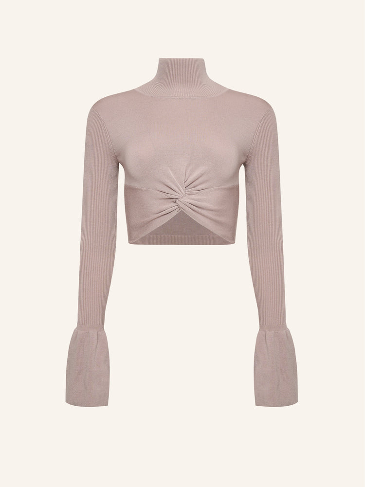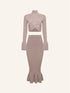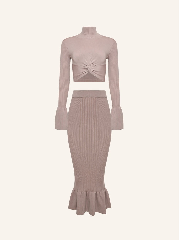 A knitted two-piece outfit featuring a midi-length mermaid skirt and a cropped turtleneck top with flared sleeves and a decorative knot in the front