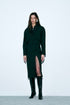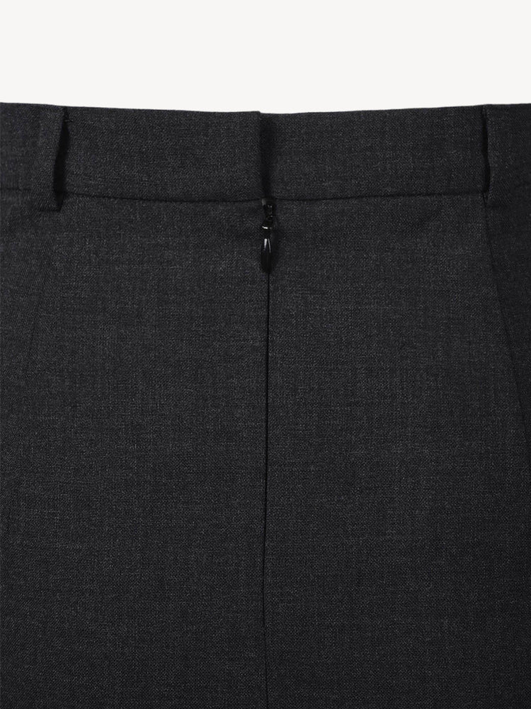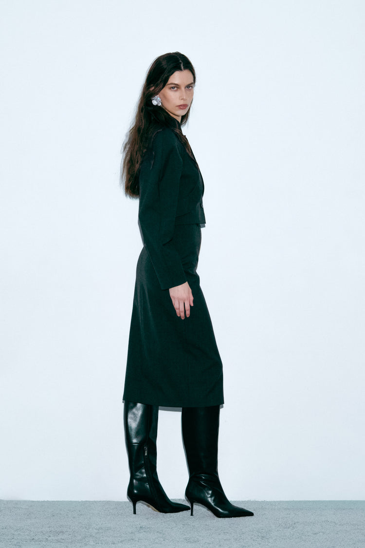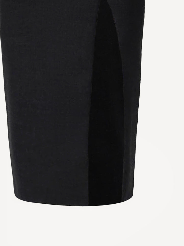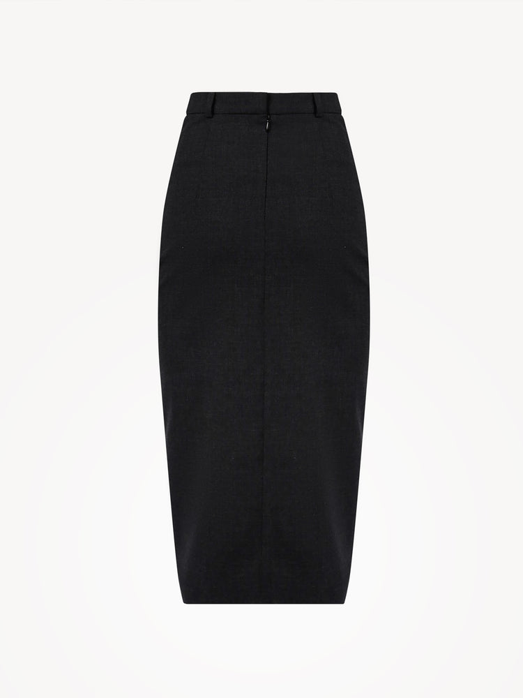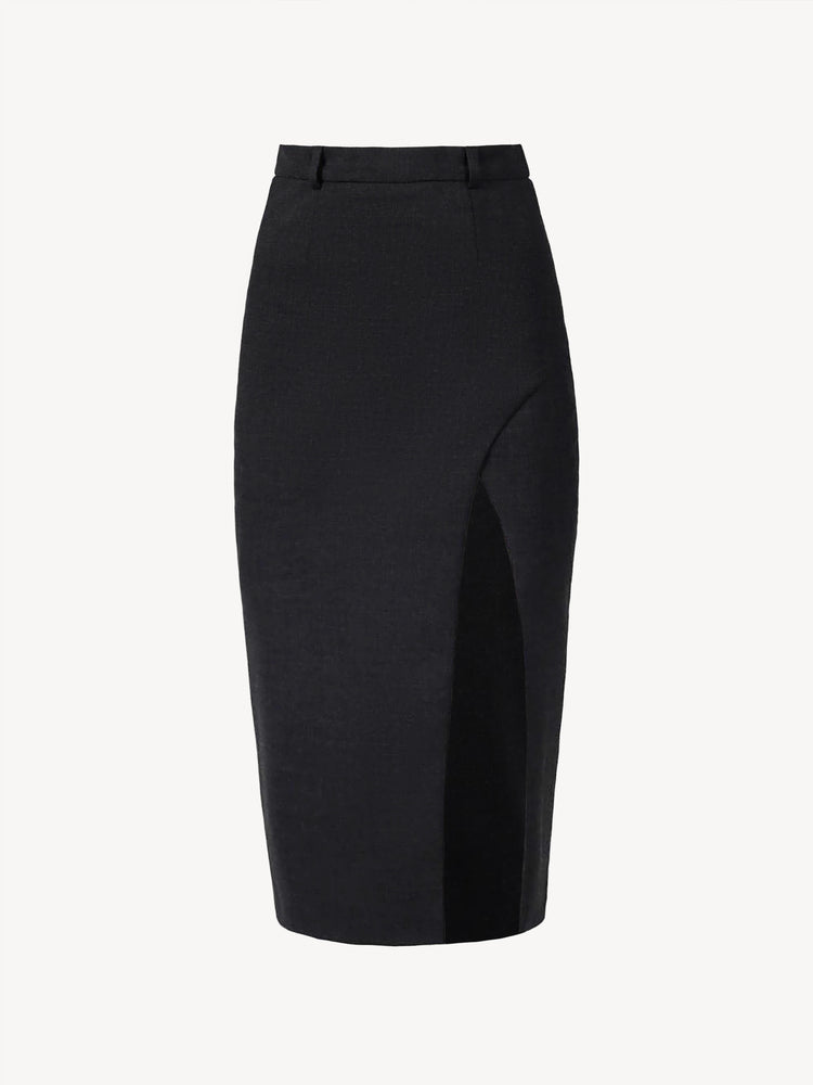 Midi pencil skirt with a slit, high waist, and zipper closure.