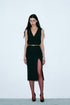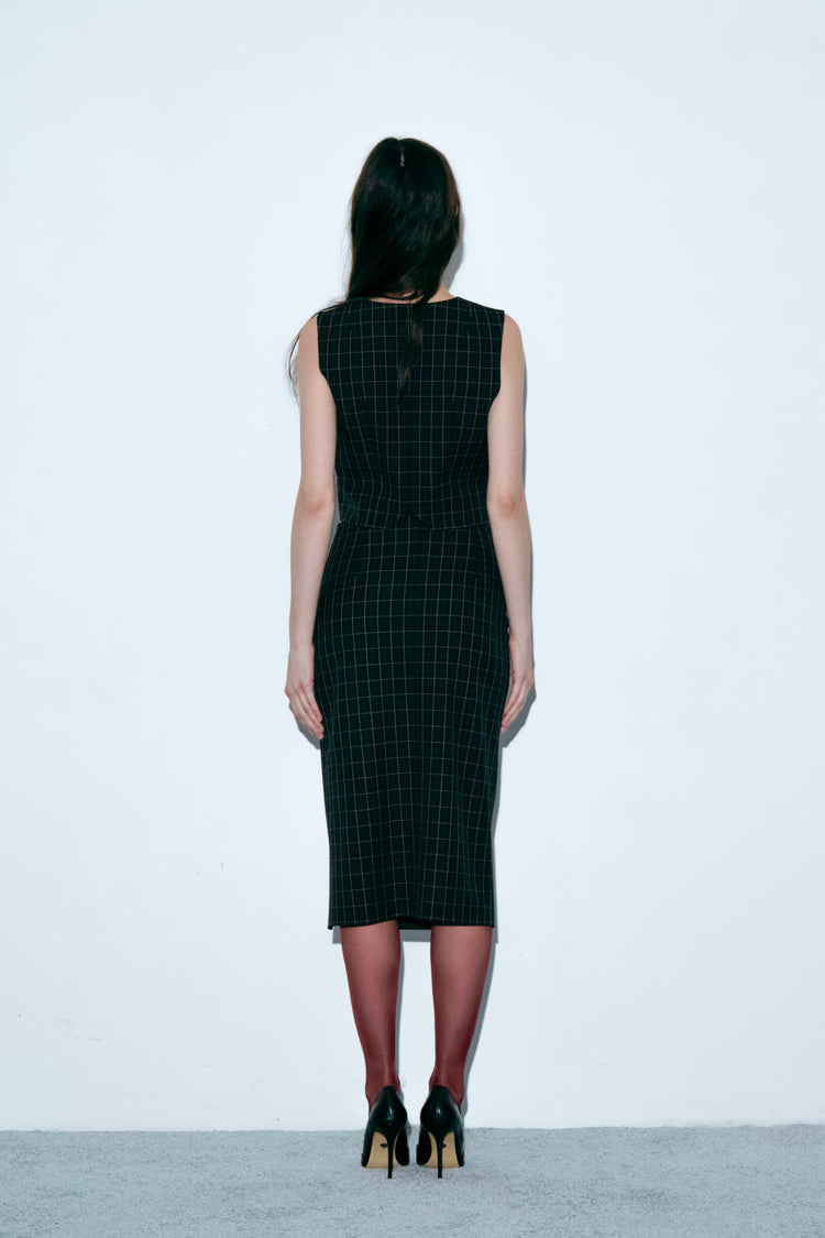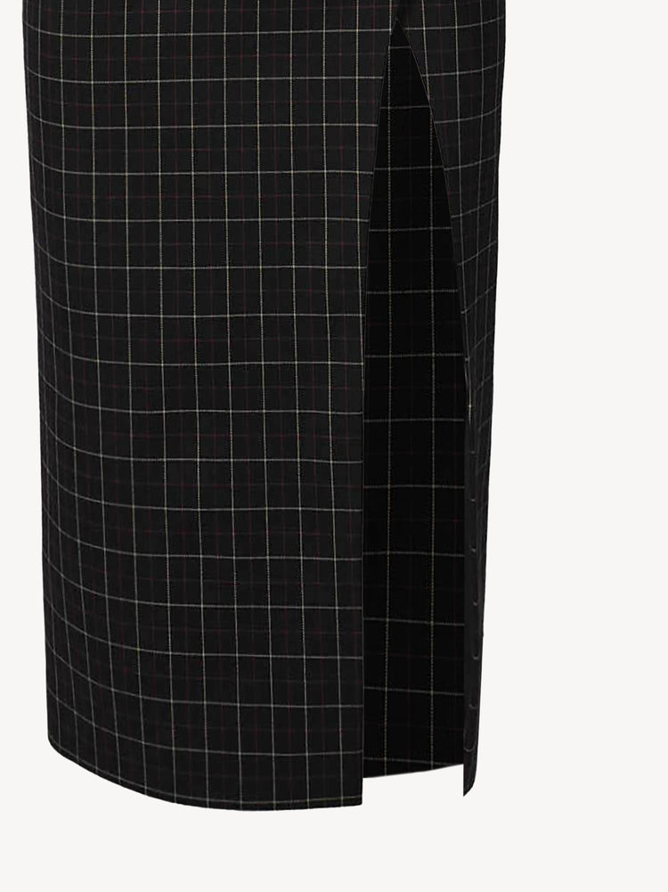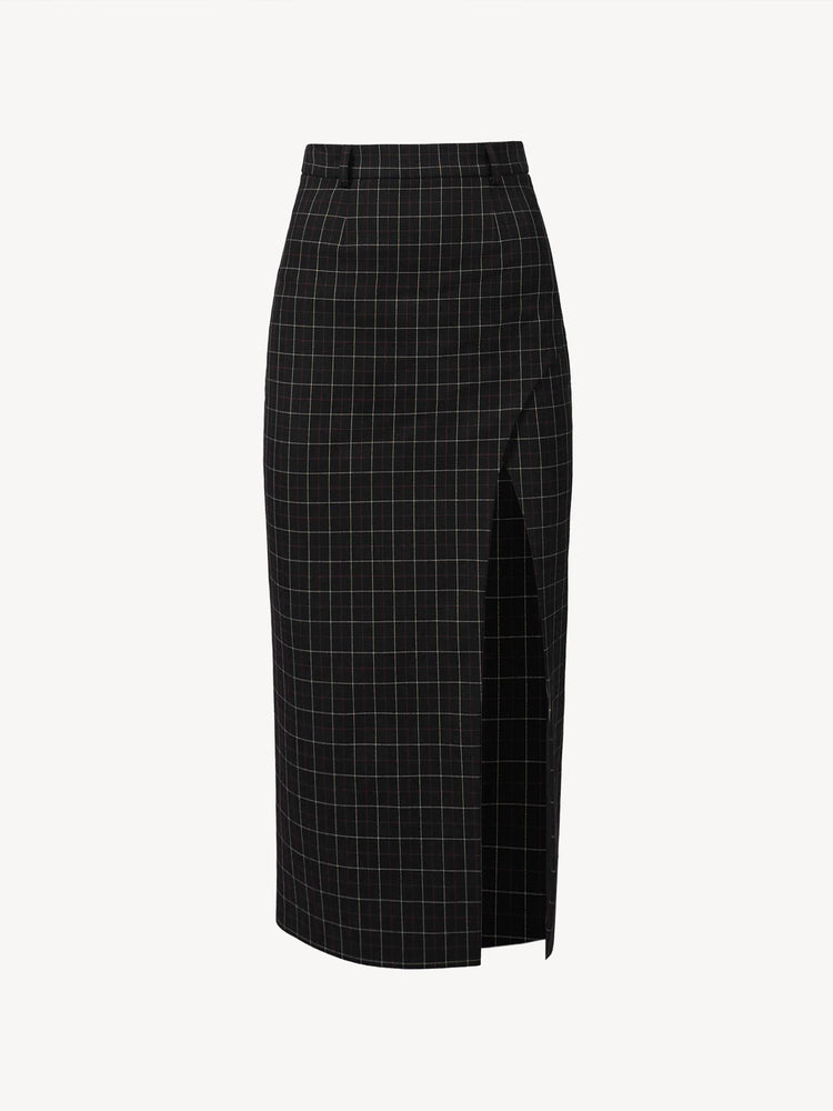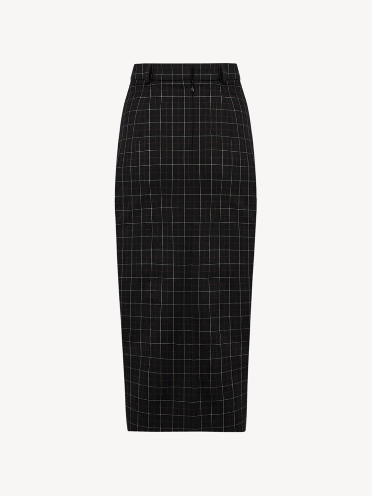 Midi pencil skirt with a slit, high waist, and zipper closure.