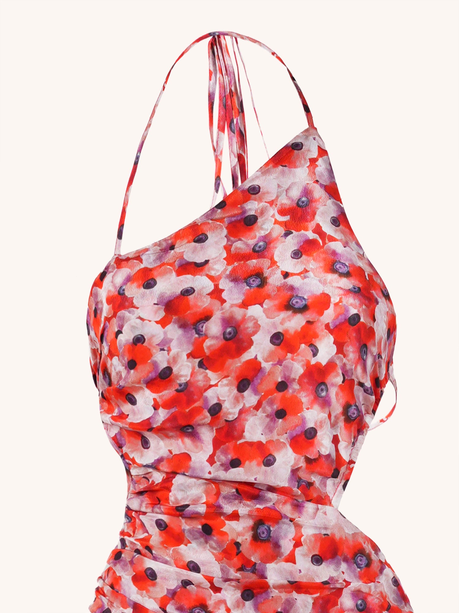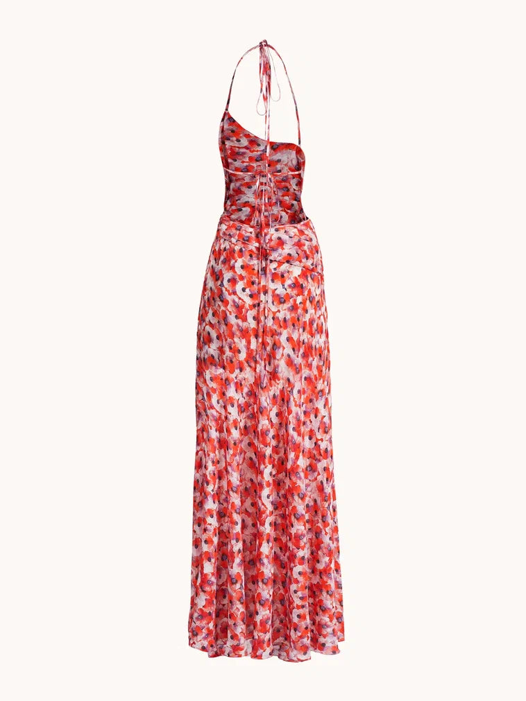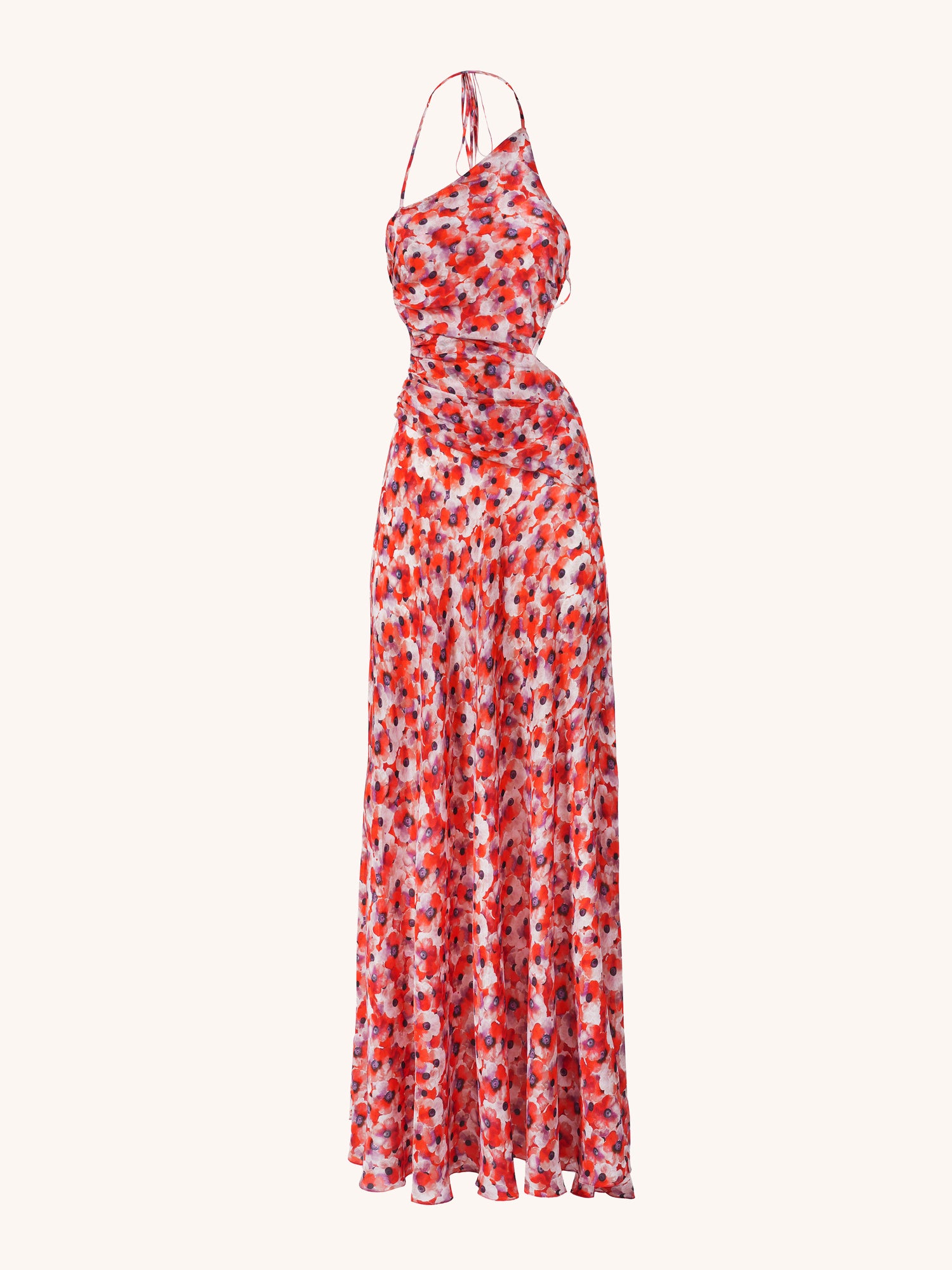 Maxi dress made of natural silk with ties, an asymmetrical top, an open back, and draping.