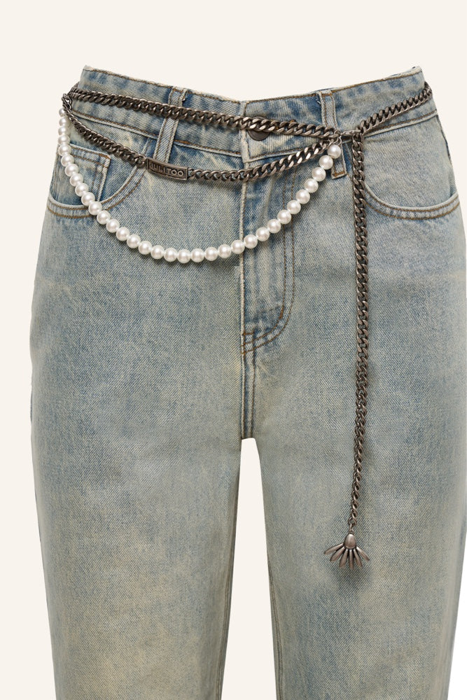 Silver-tone chain-link belt from JT featuring silver-tone hardware, signature daisy, pearl belt and chain-link detailing