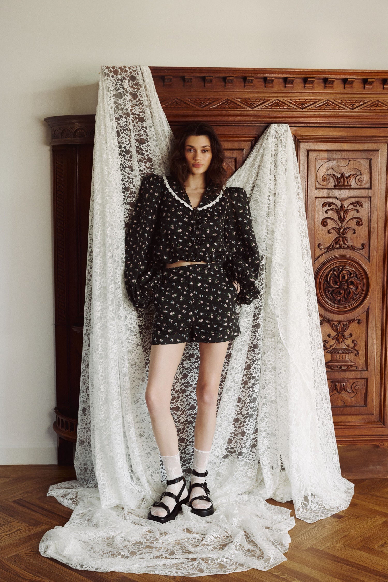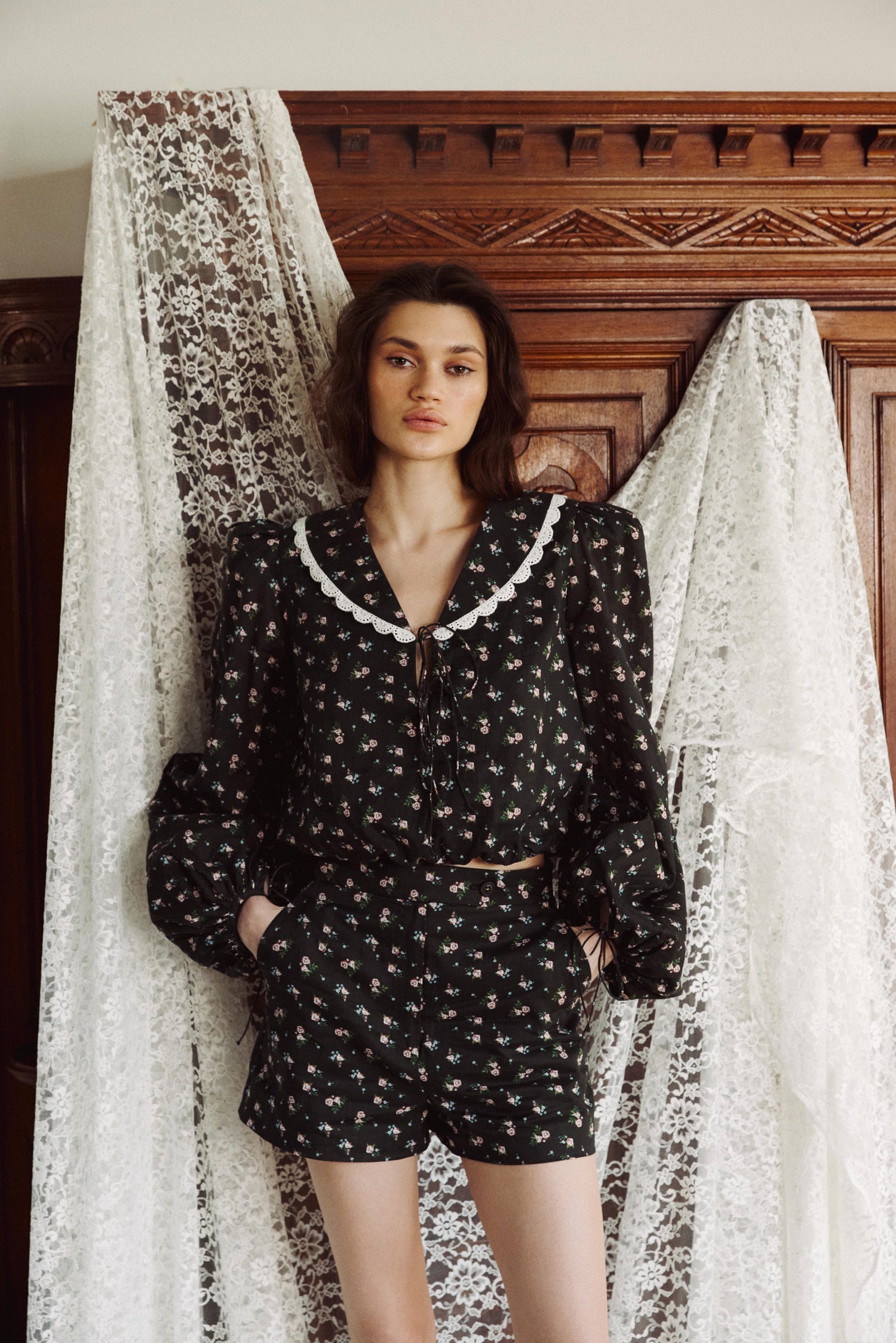 A cotton suit consisting of two elements: a top with voluminous sleeves with drawstrings and shorts with a zipper.