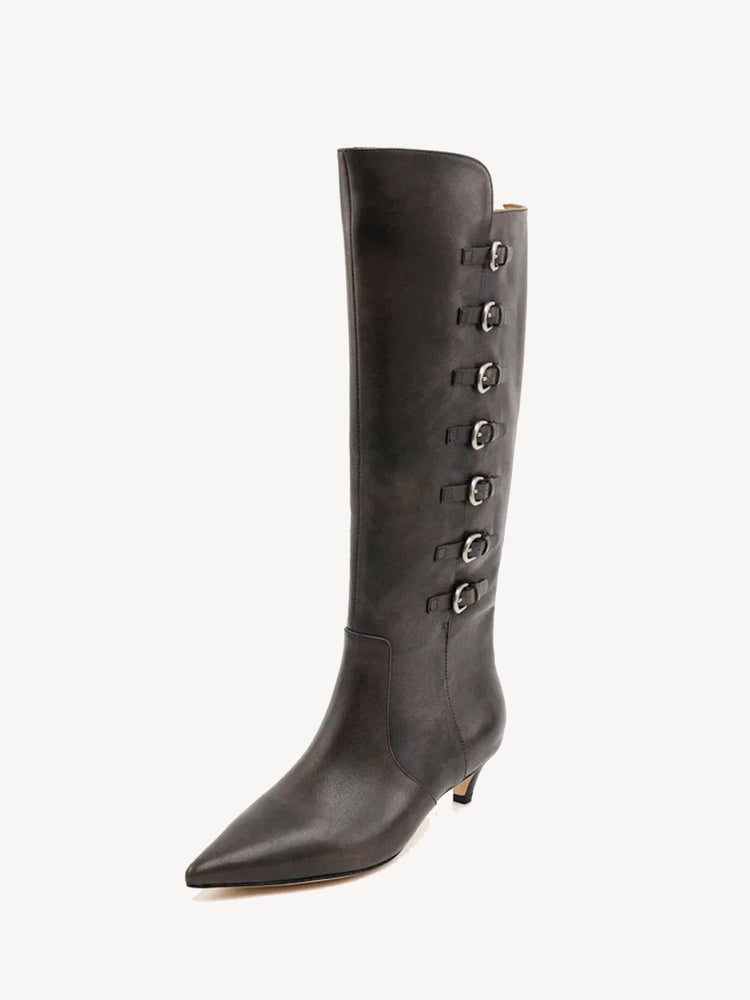 Boots made of genuine leather with decorative metal fastenings, knee-length, cone heel.