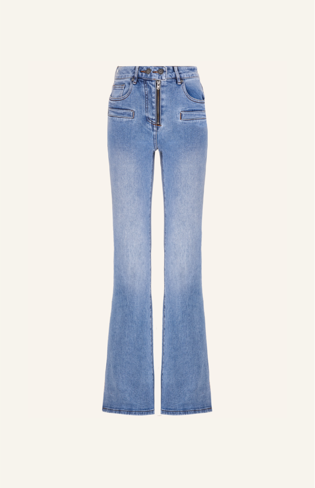 Vintage-style flared jeans with a low rise, faux pockets, and a leather patch