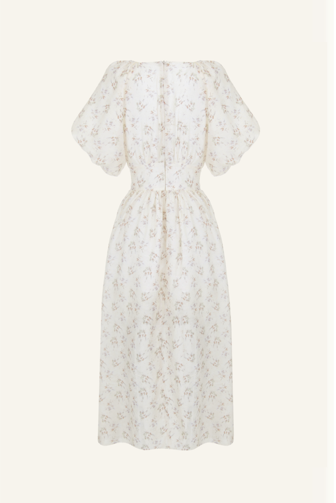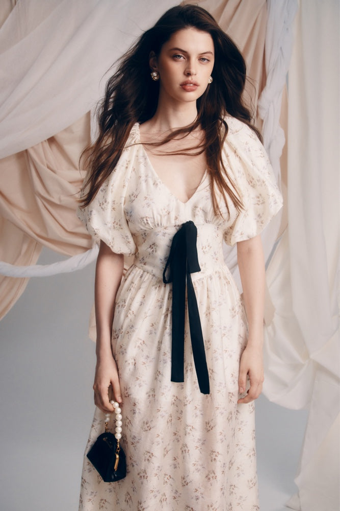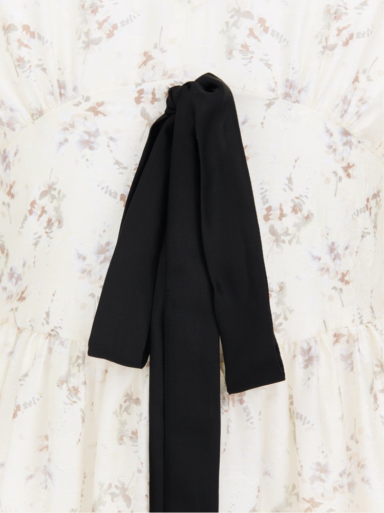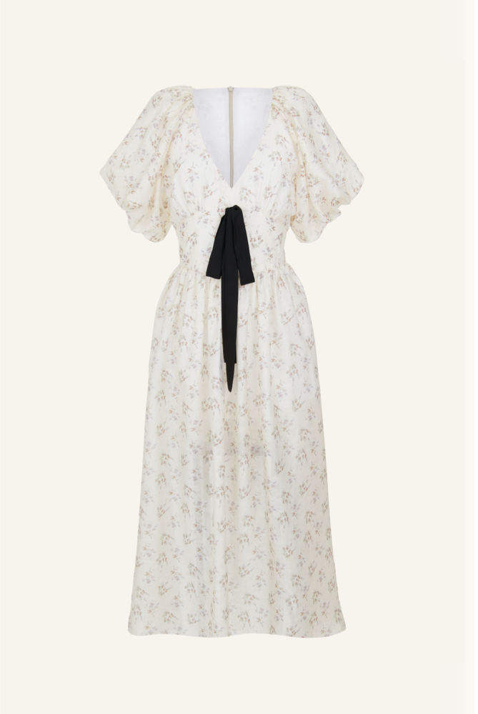 Fitted midi dress with voluminous short sleeves and a decorative bow at the waist