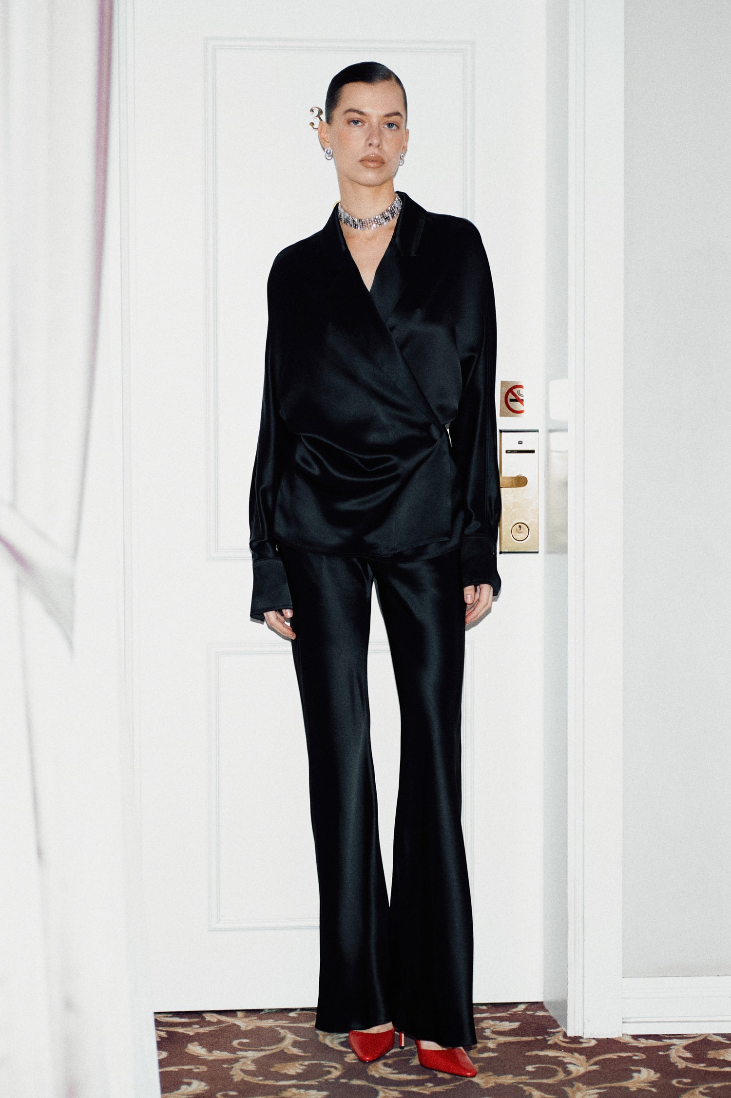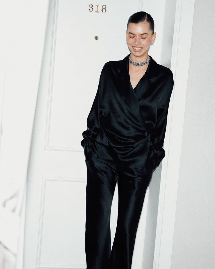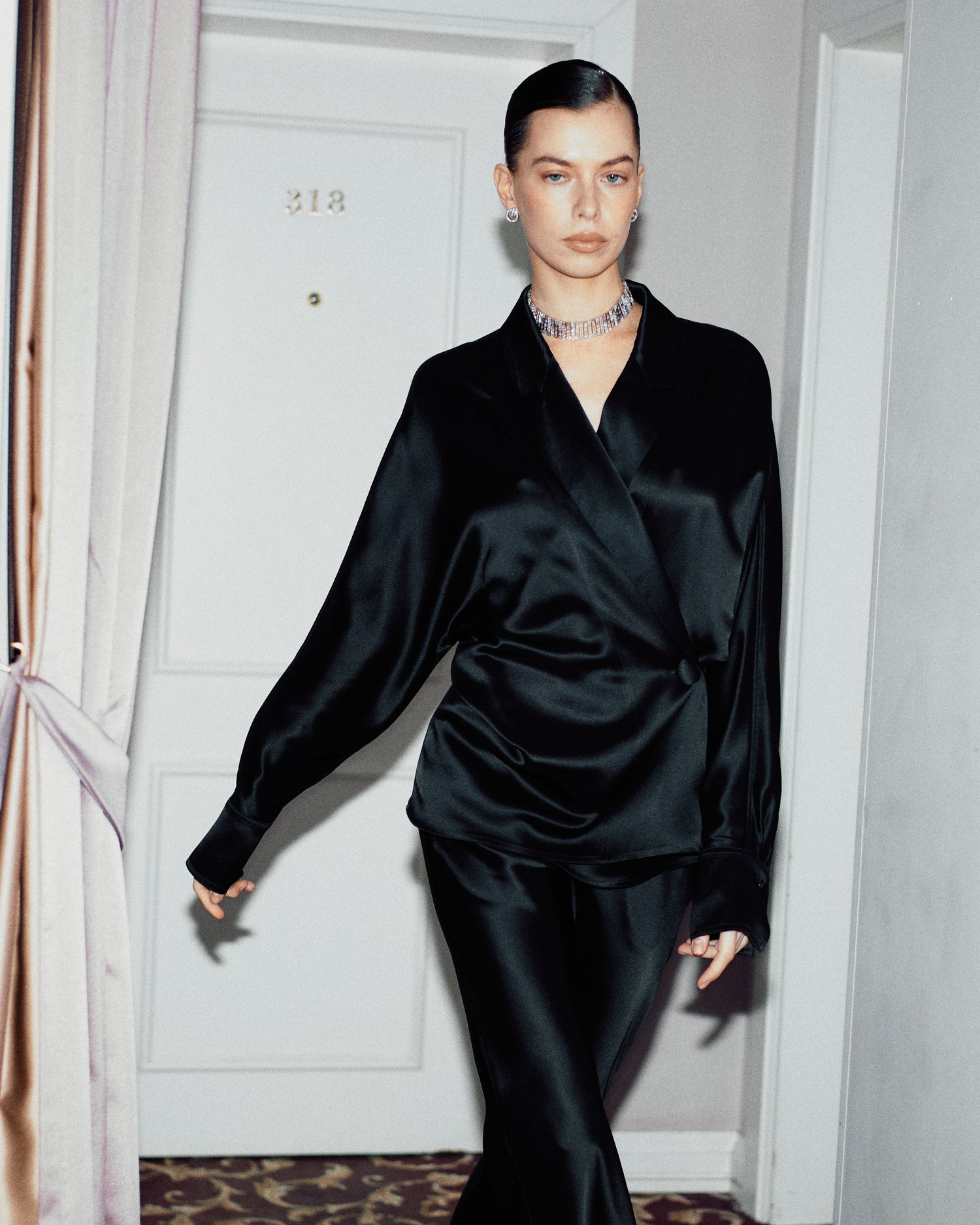 Flowing Japanese silk kimono wrap with lapels, buttoned cuffs, and sleeves with cuffs.