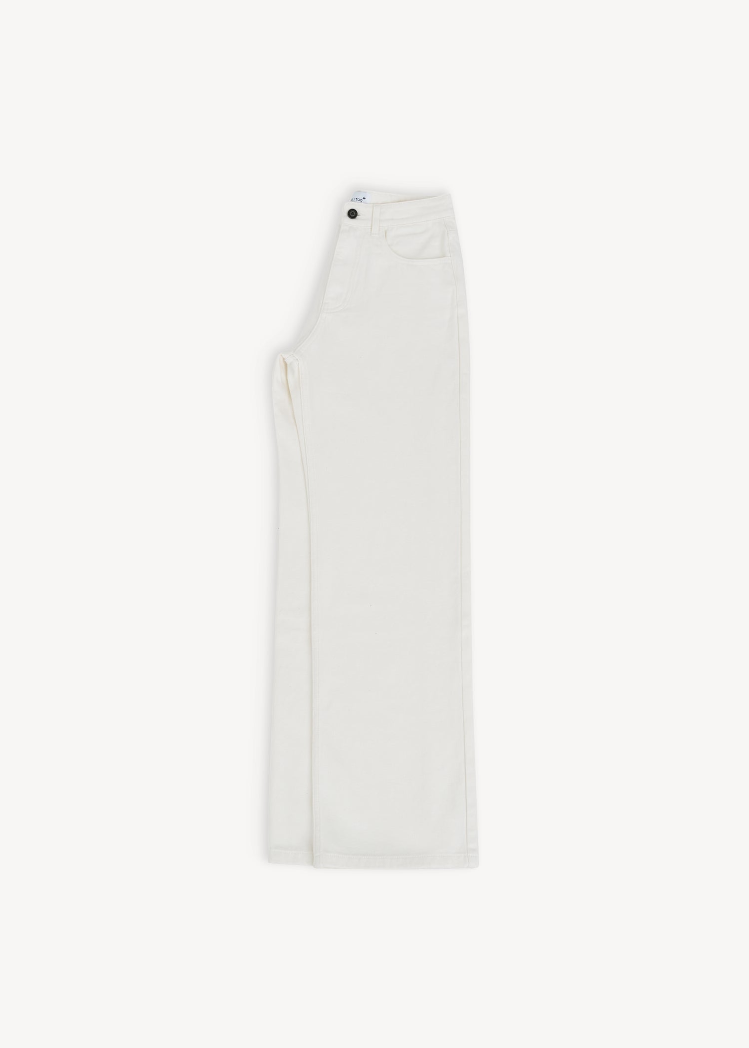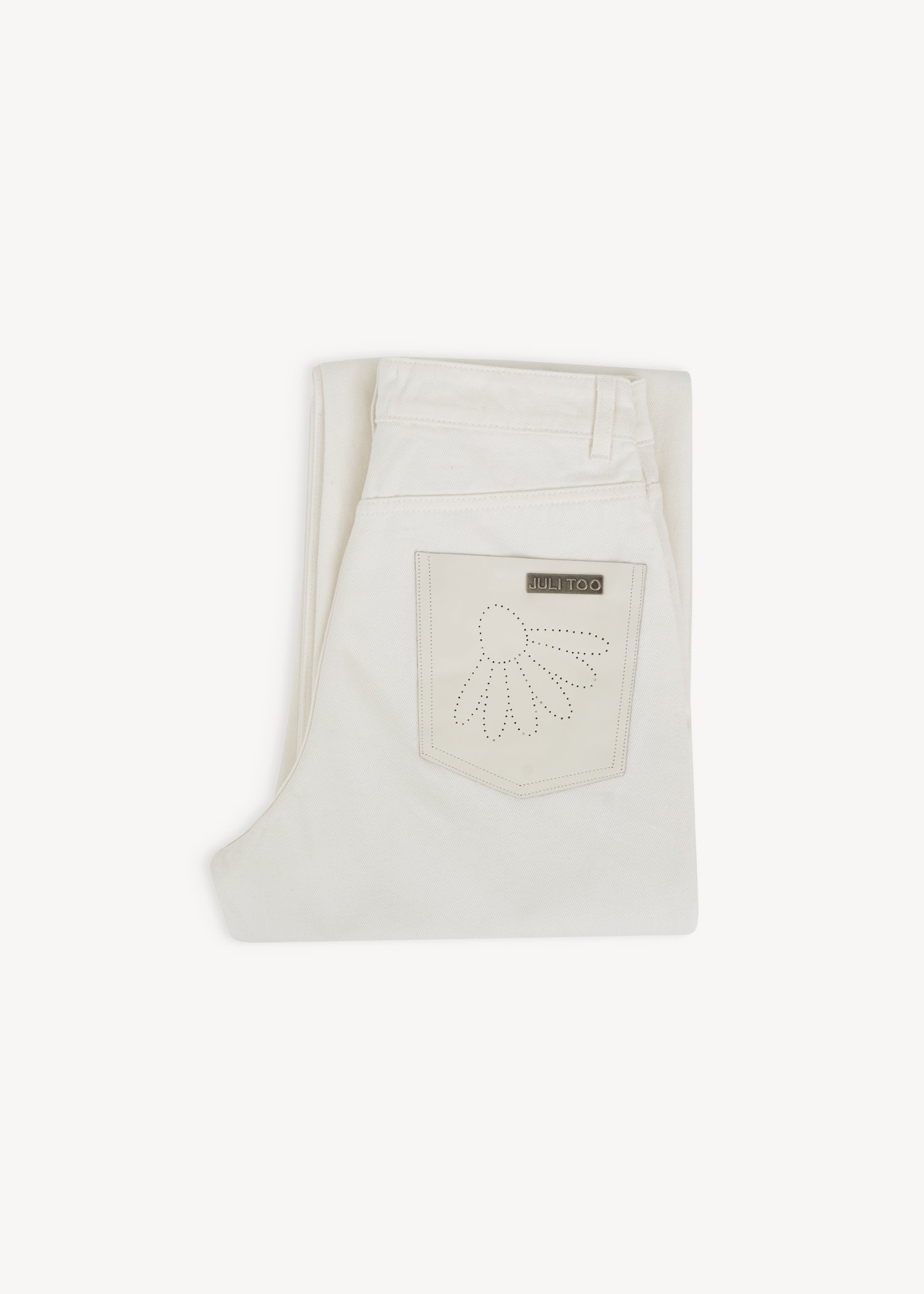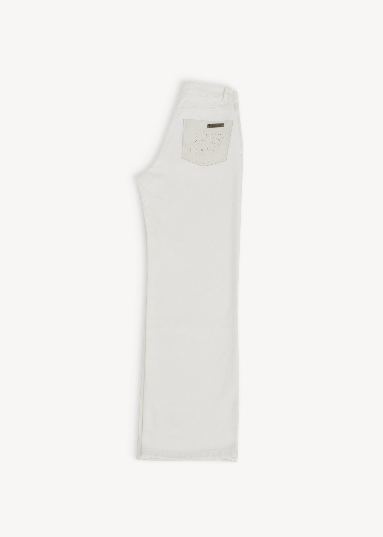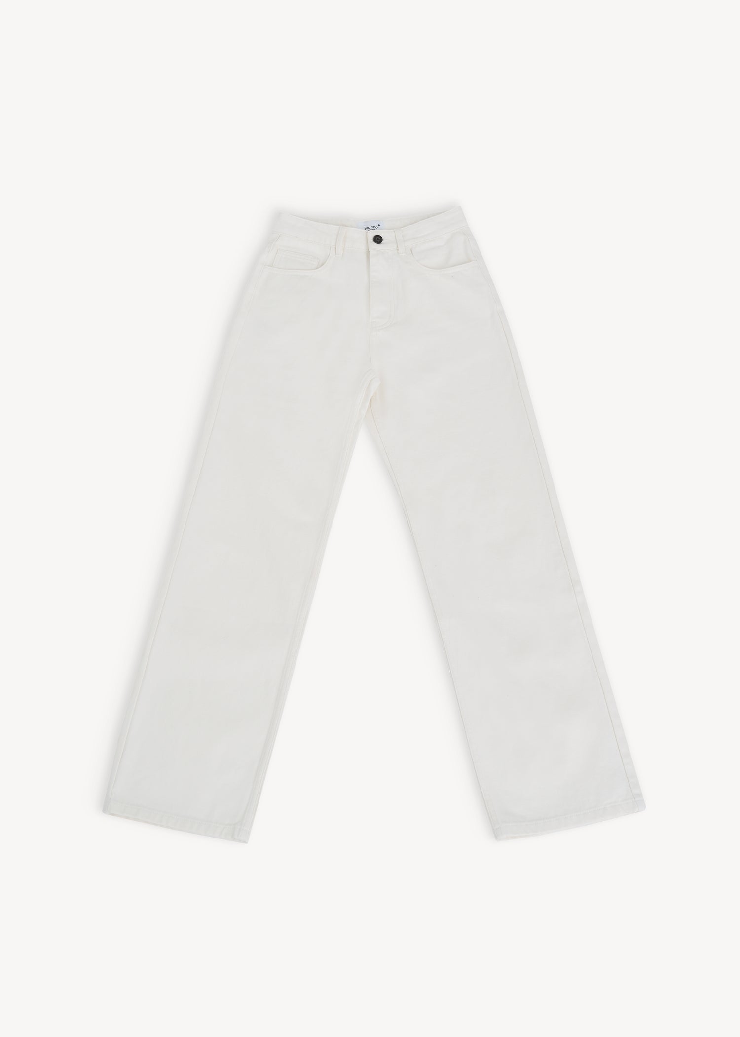 Jeans with a medium fit made of thick cotton denim. Leather pocket. A model with a zipper and button closure.