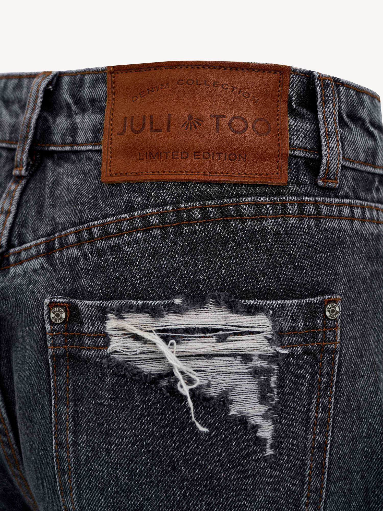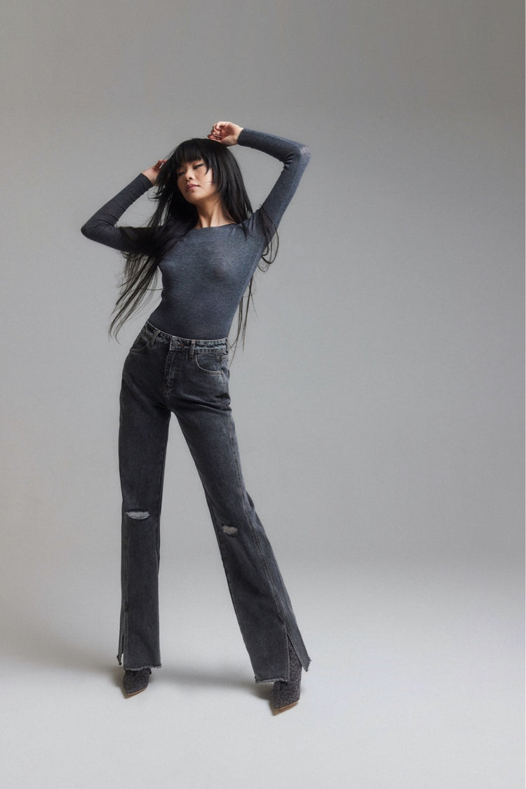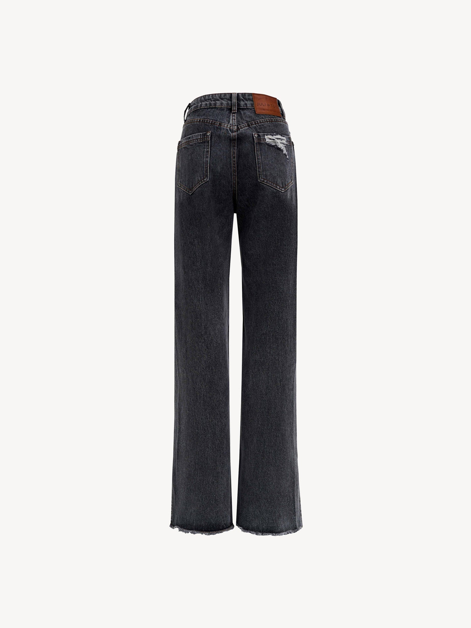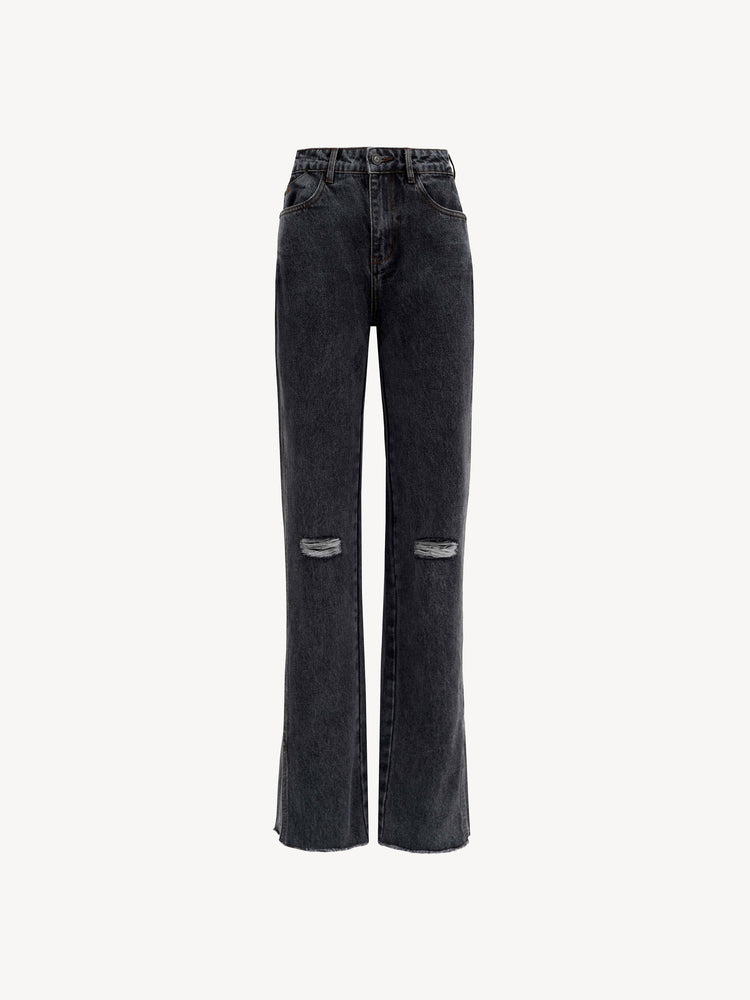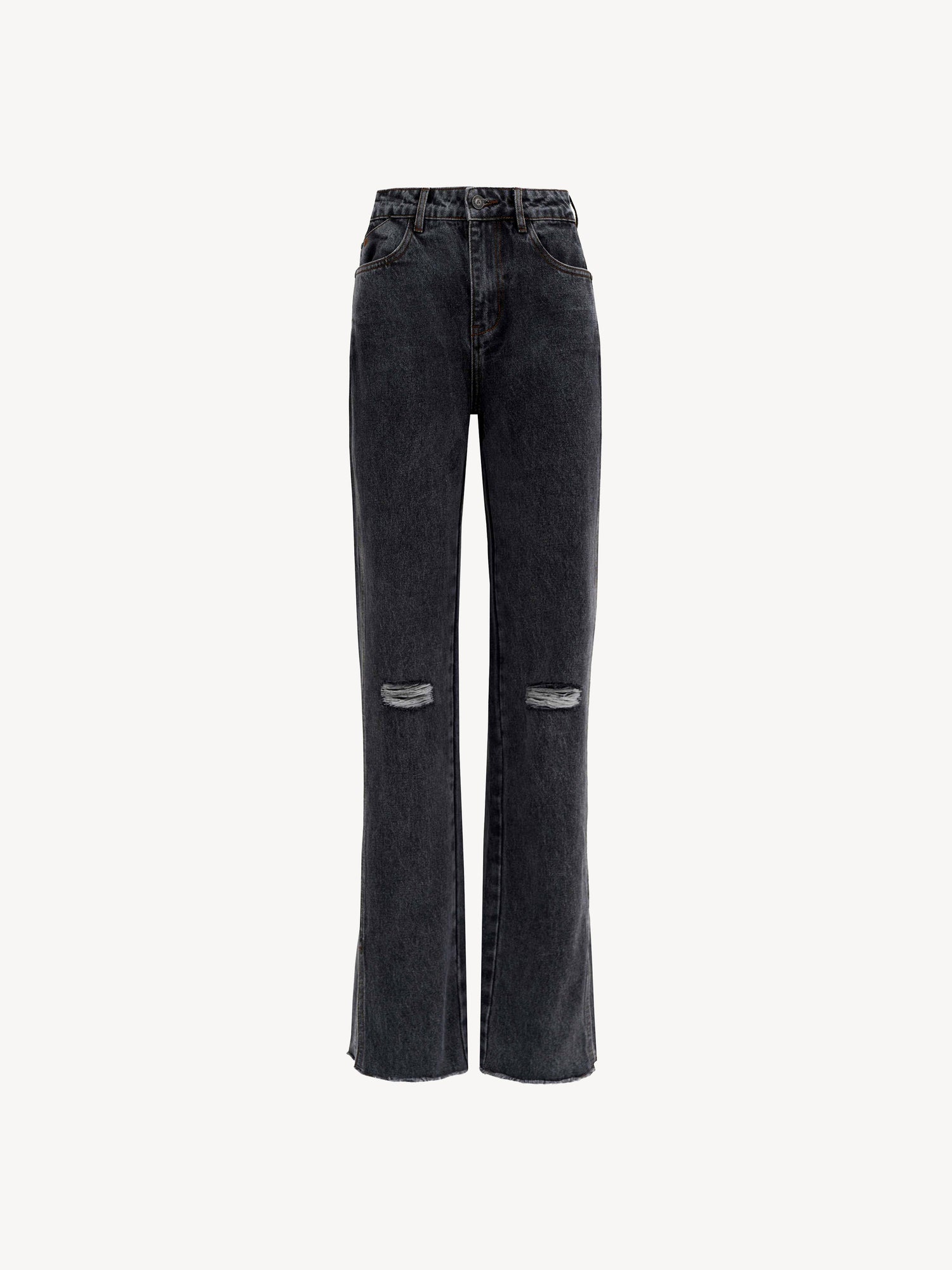 High-rise straight-fit jeans with knee slits, a bottom side slit, and decorative distressing on the back pocket