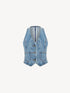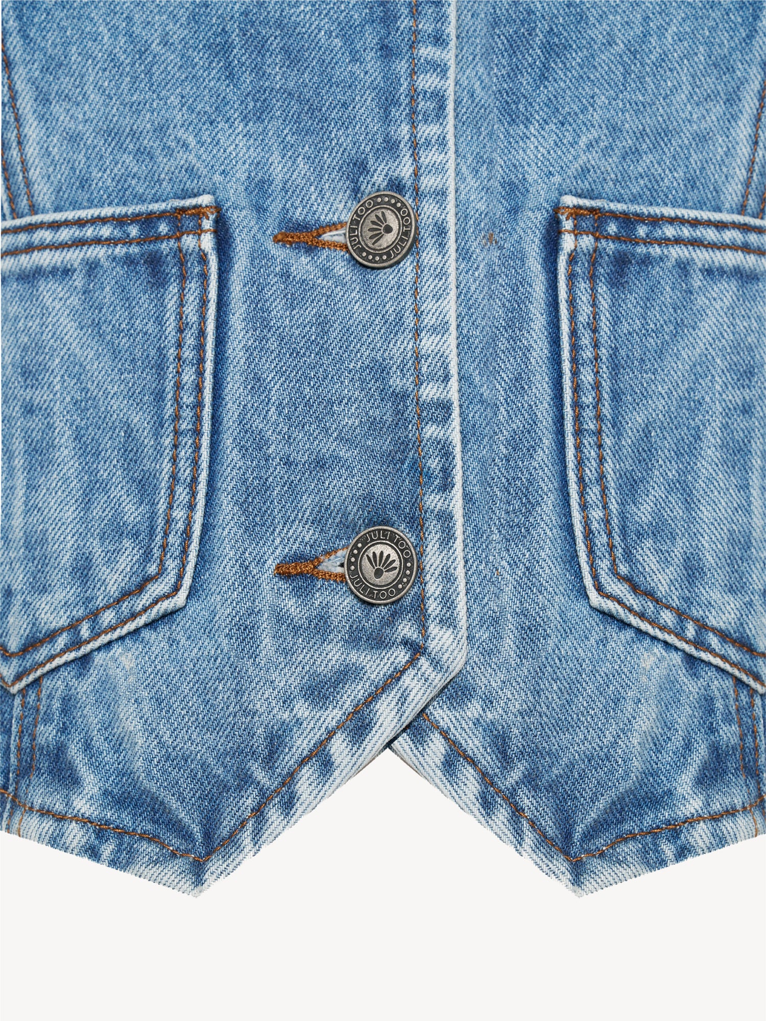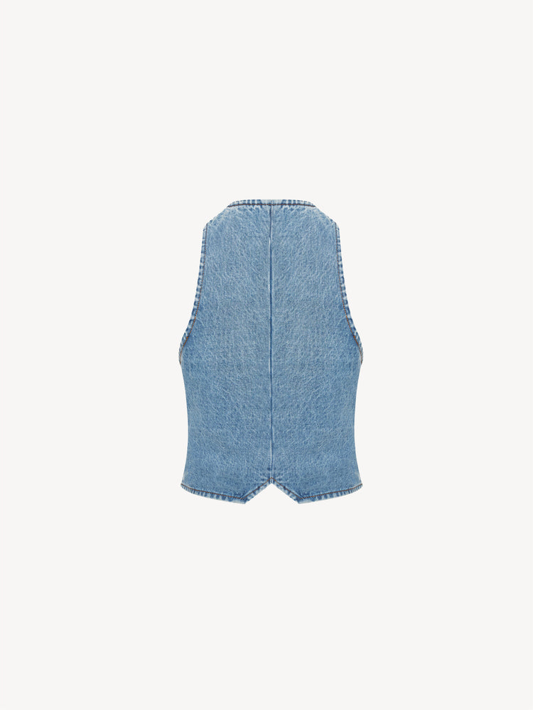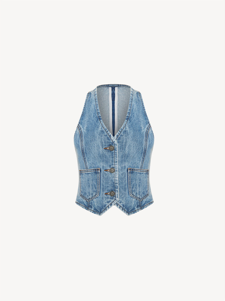 A fitted silhouette vest made of heavy denim, featuring pockets and branded hardware