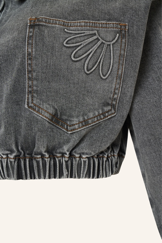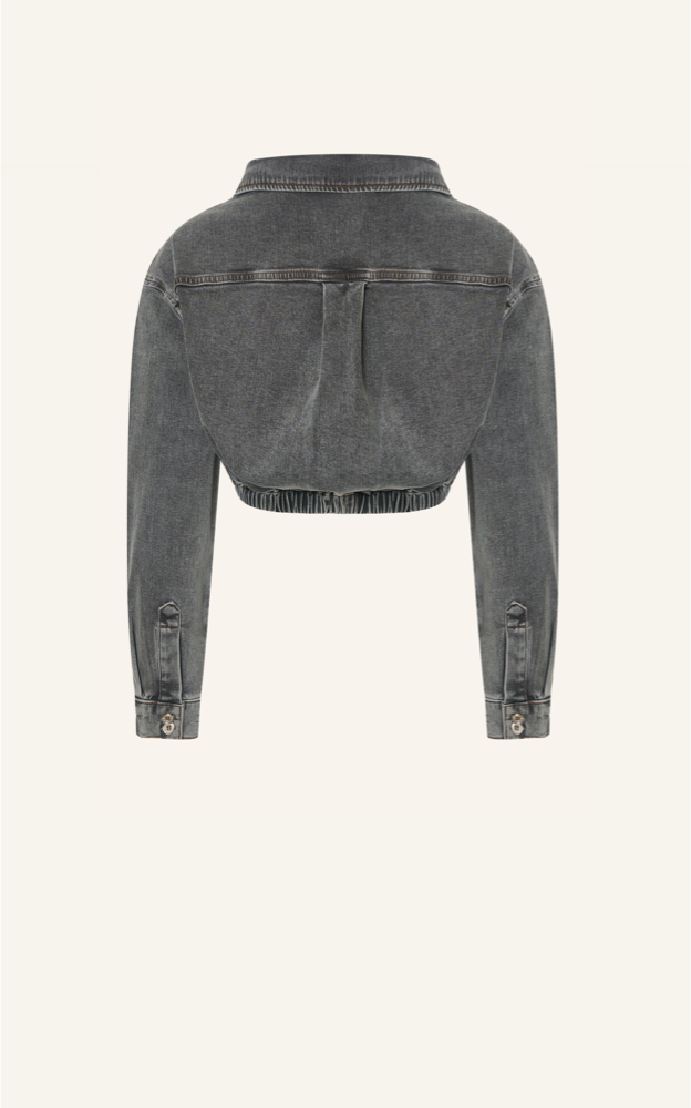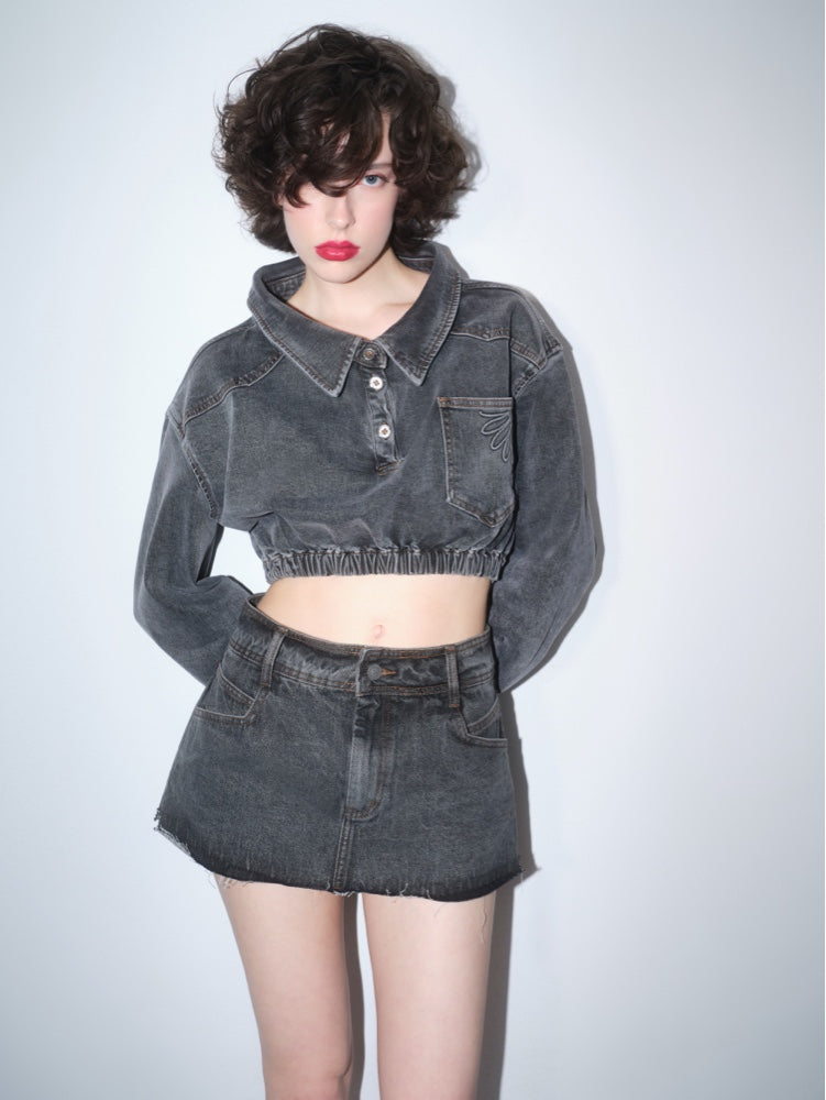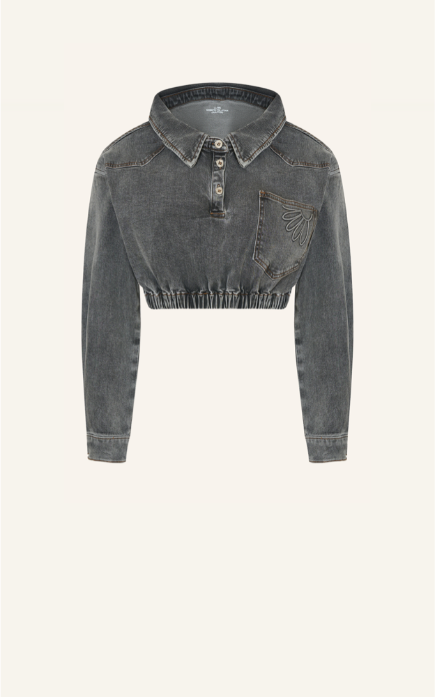 A shortened polo made of heavy denim, with a collar featuring an enlarged neckline, button closure, and elastic trim along the edge of the garment