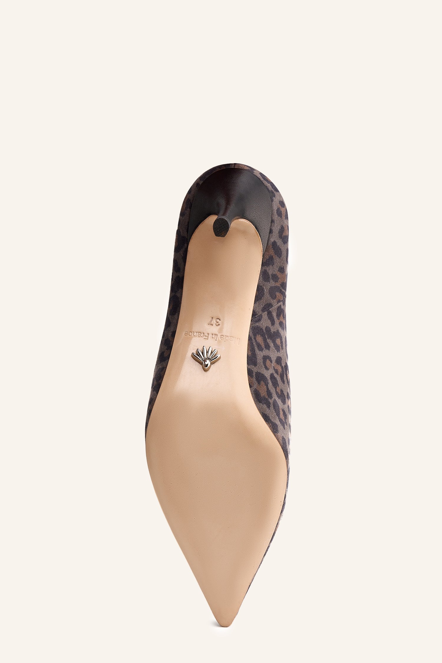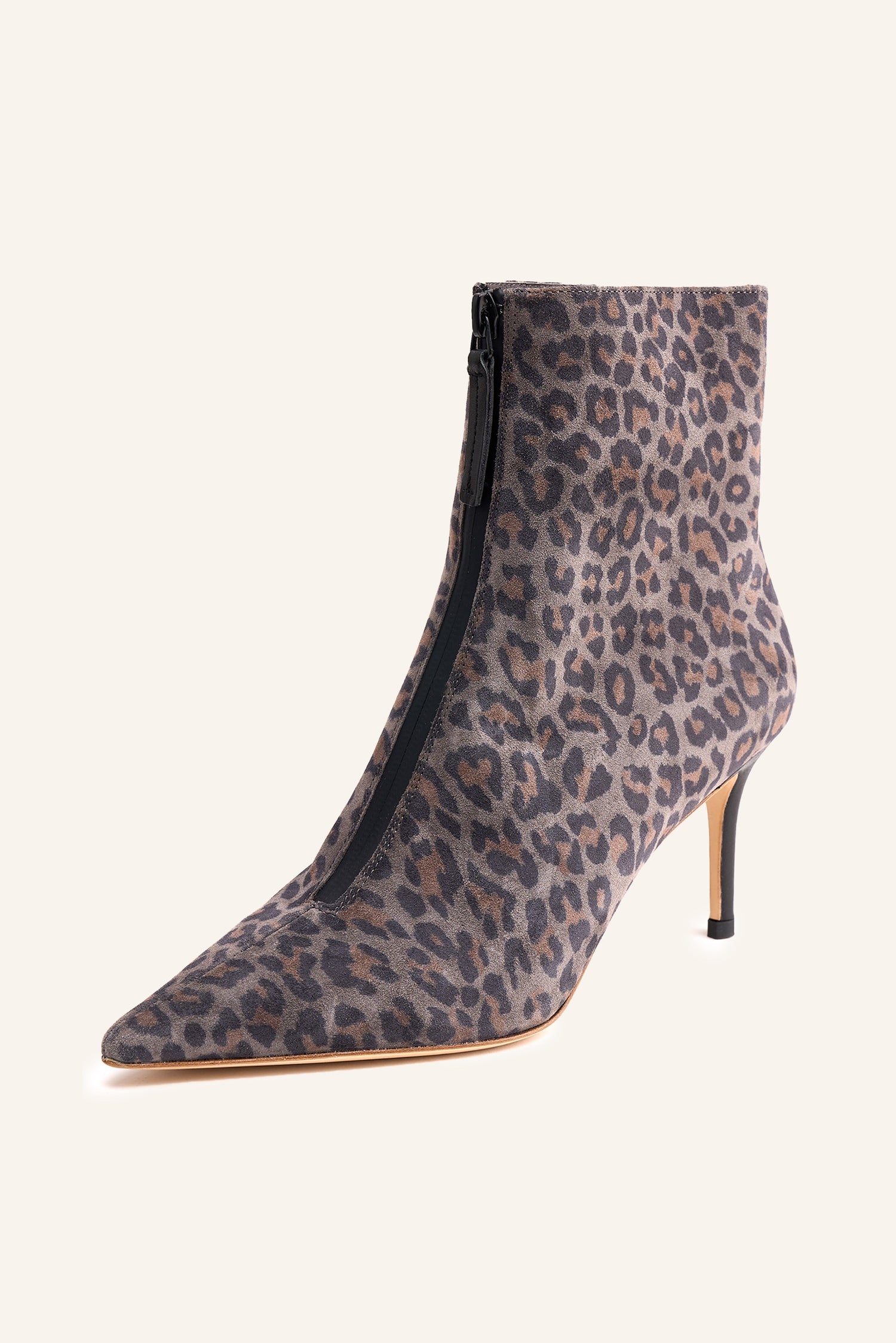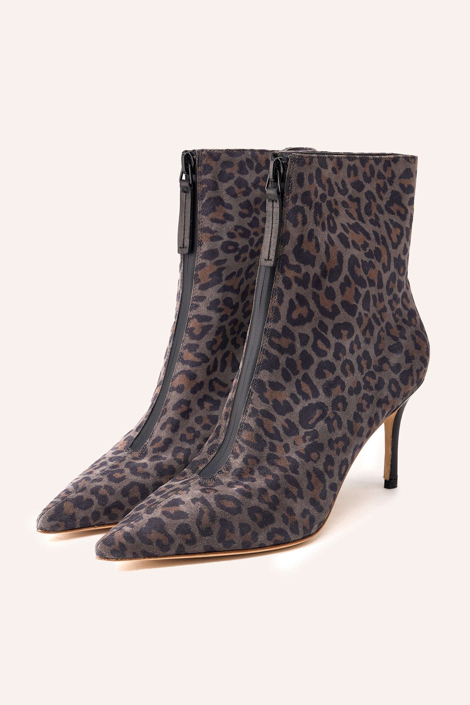 Leopard print ankle boots made of soft leather, with a pointed toe and a zipper closure