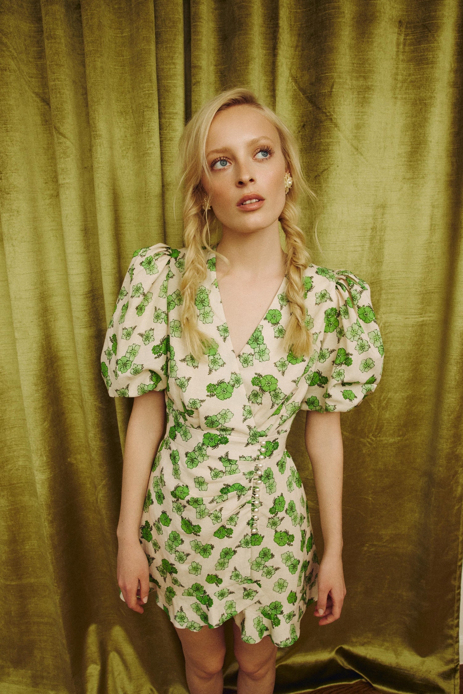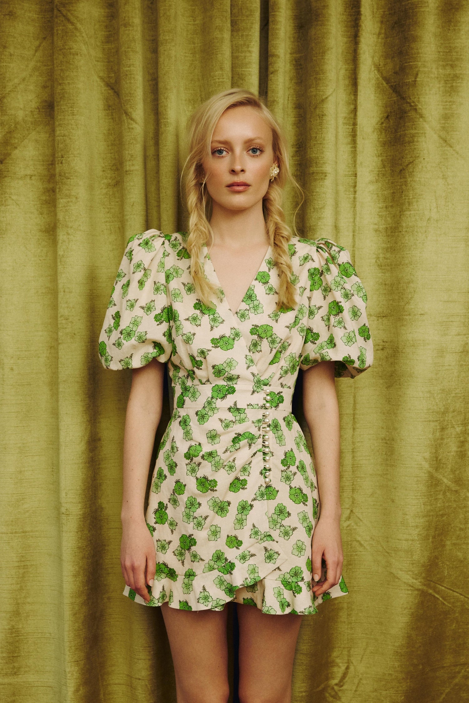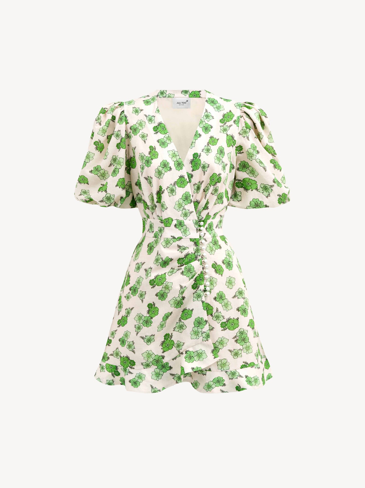 A mini-length wrap dress, short airy sleeves, decorative loops with pearl buttons.