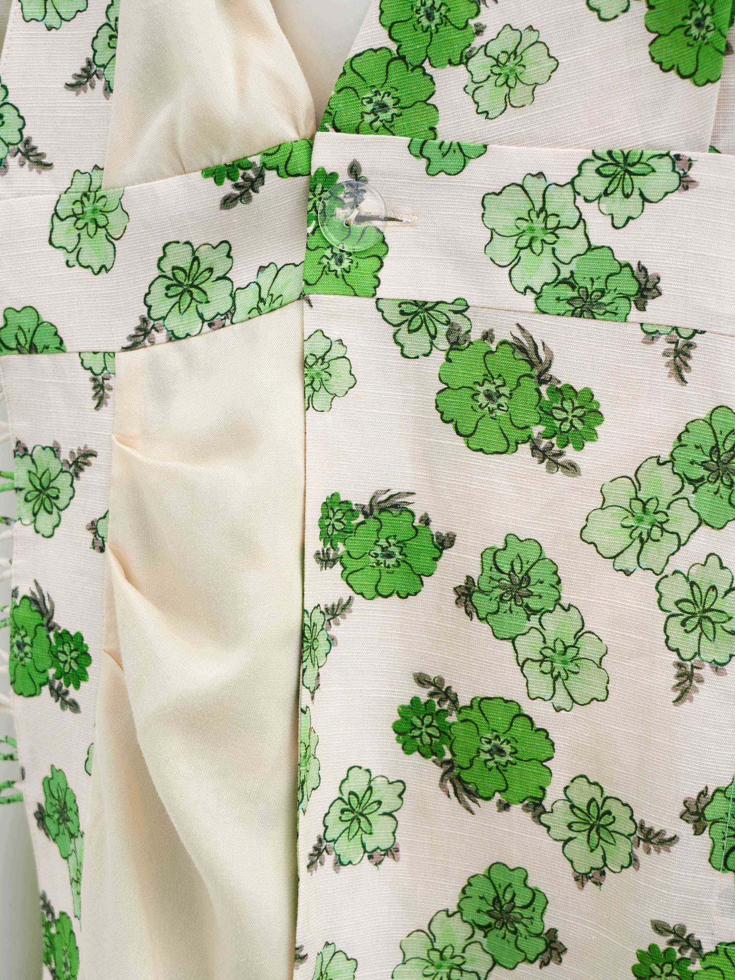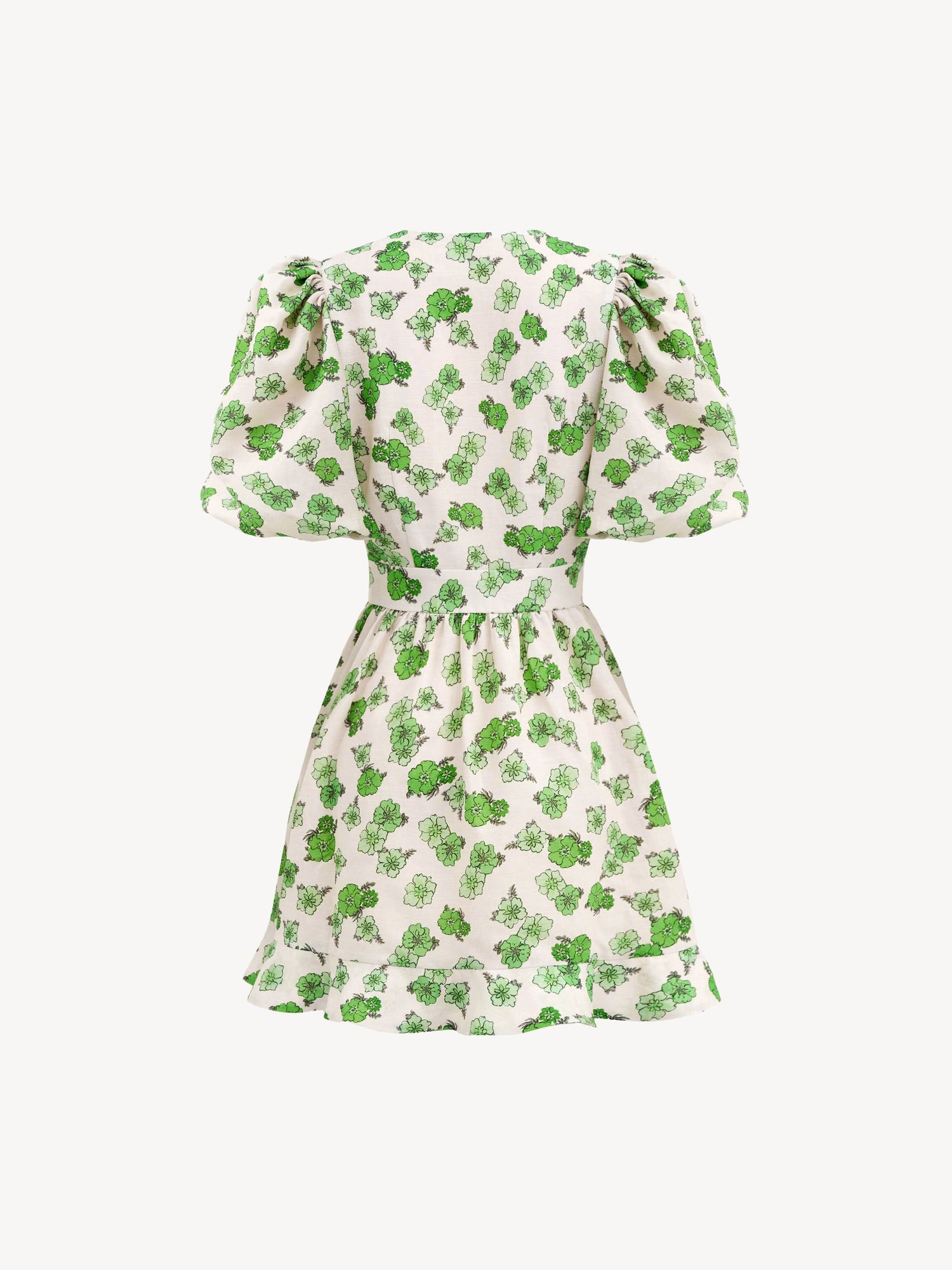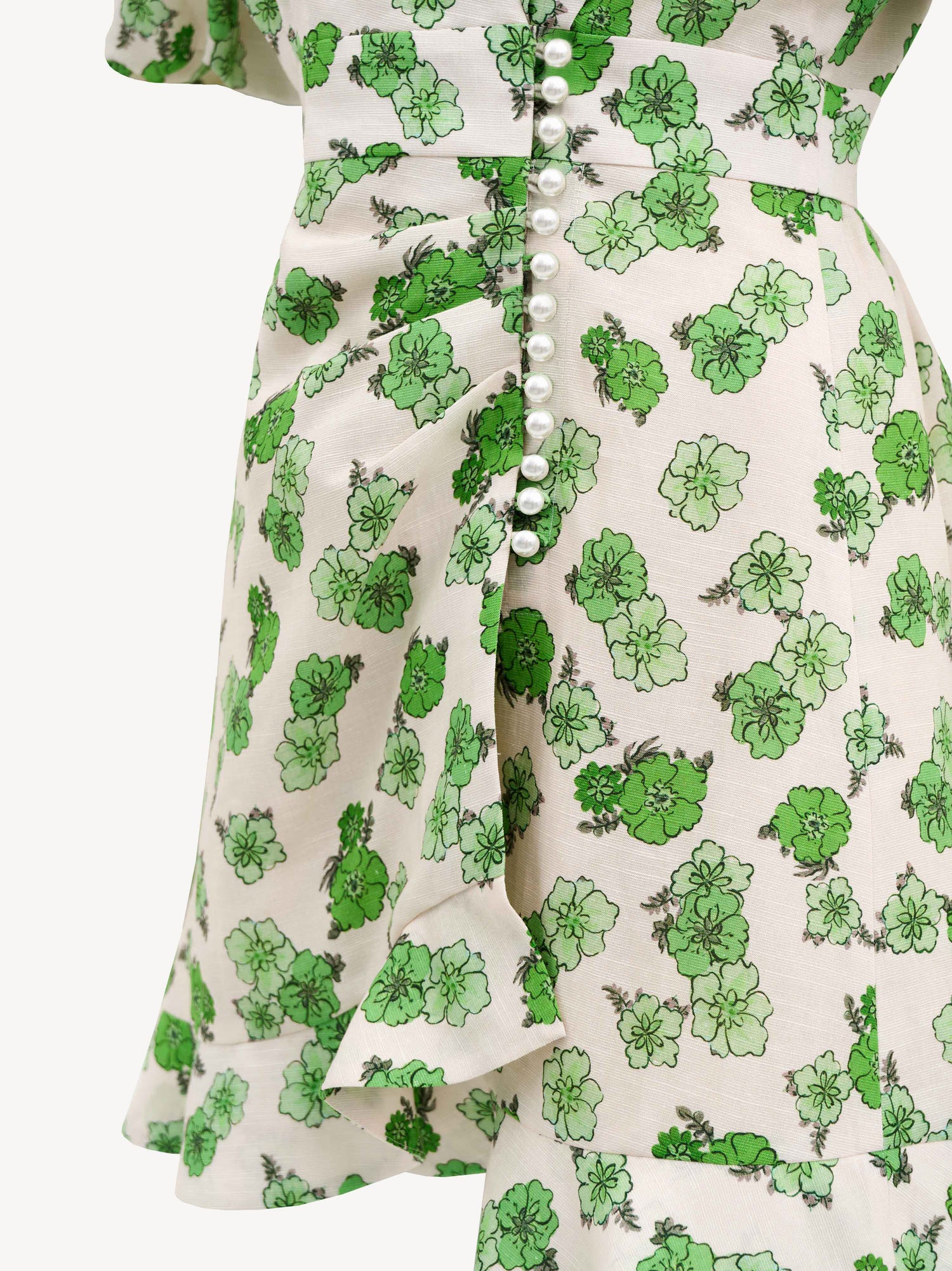 A mini-length wrap dress, short airy sleeves, decorative loops with pearl buttons.