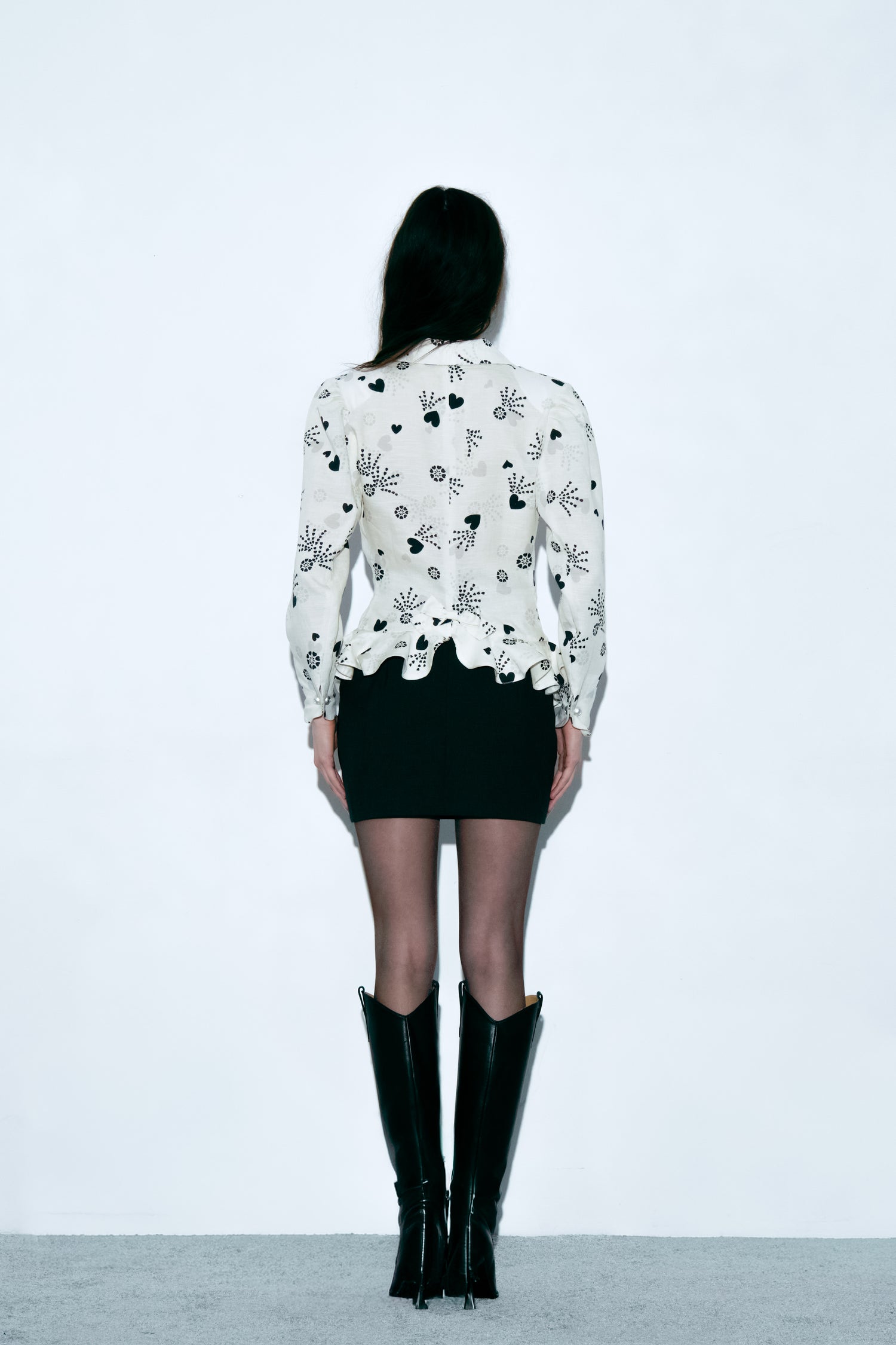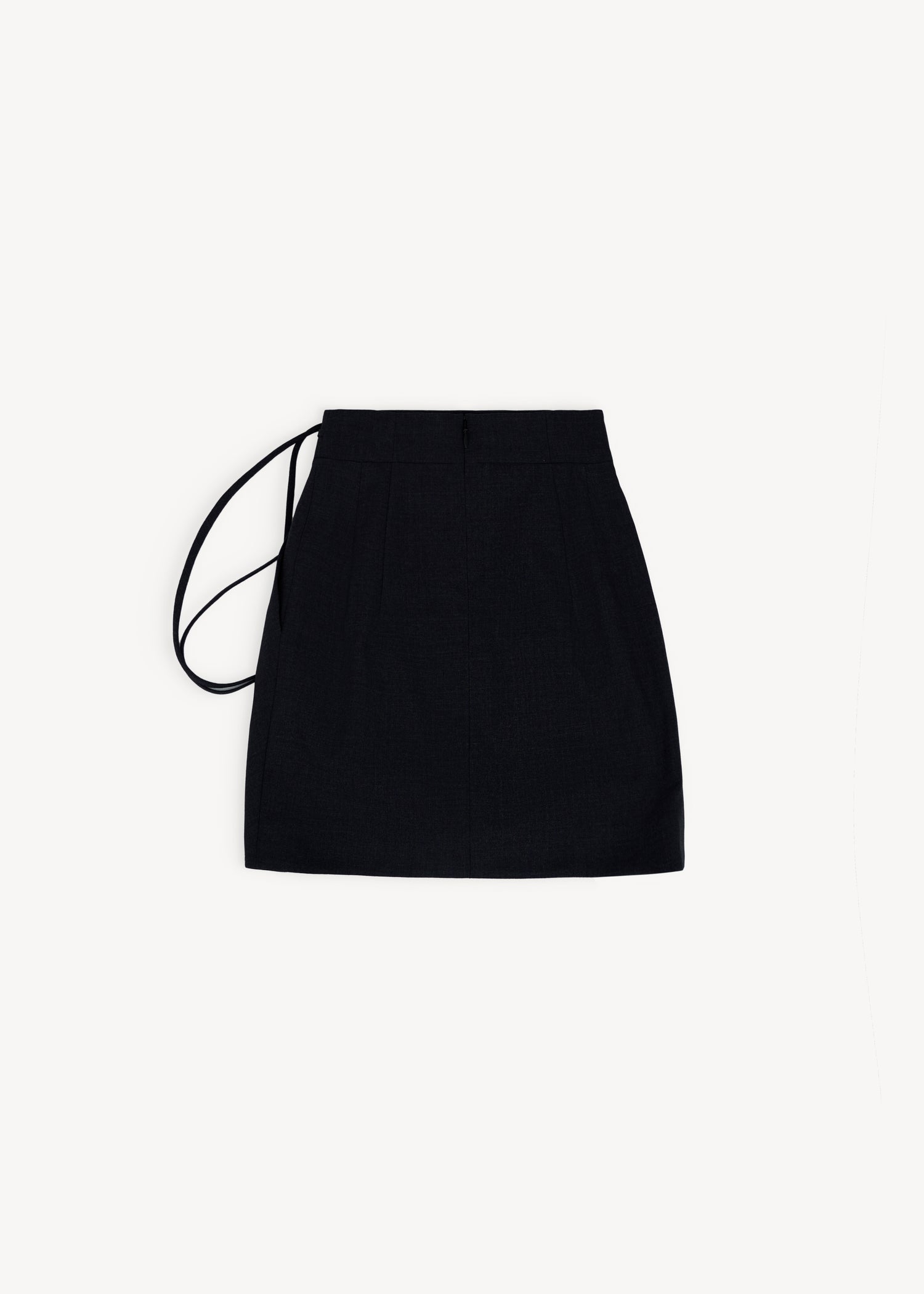 A voluminous mini skirt with a high waist, complemented by decorative ties on the waistband.
