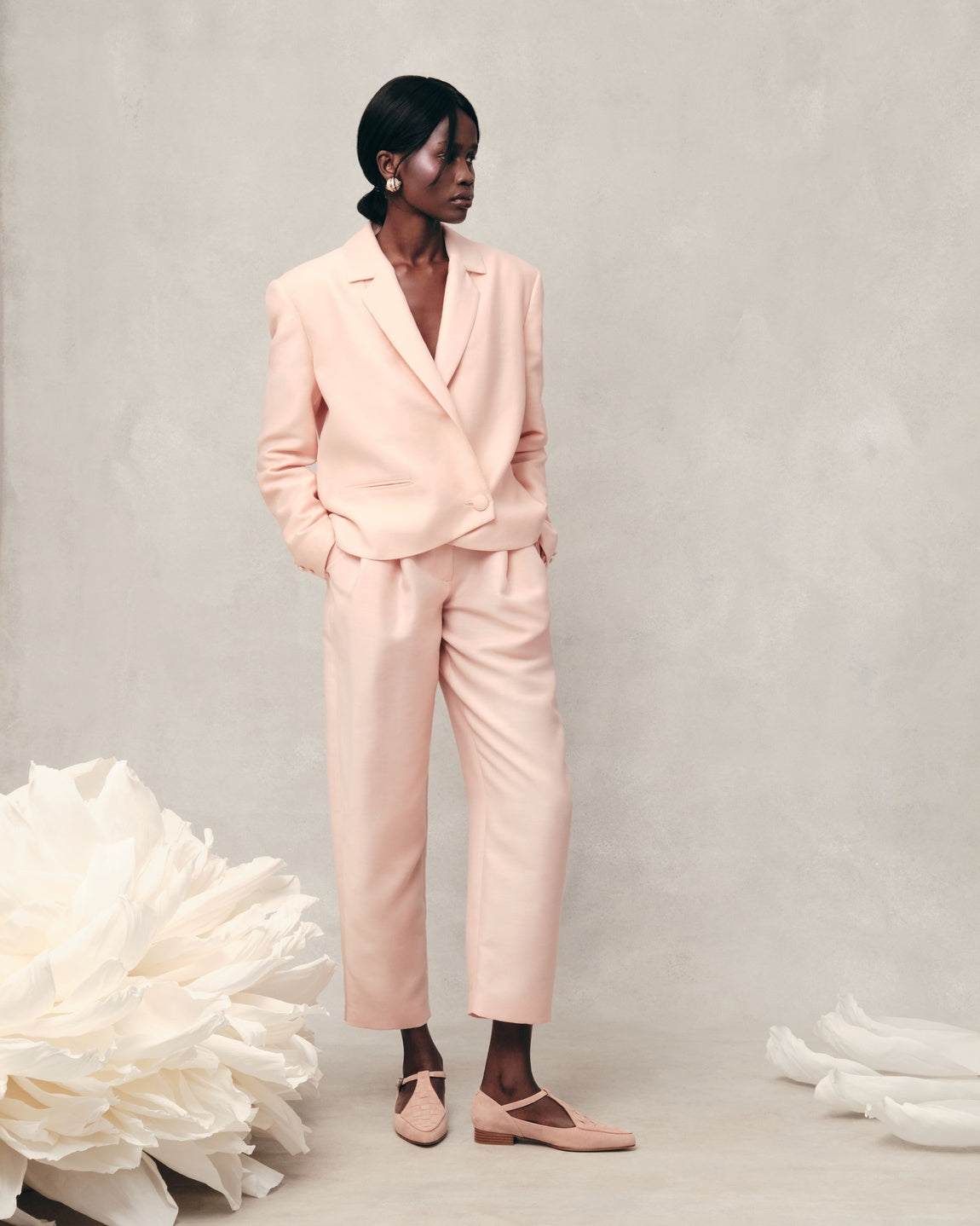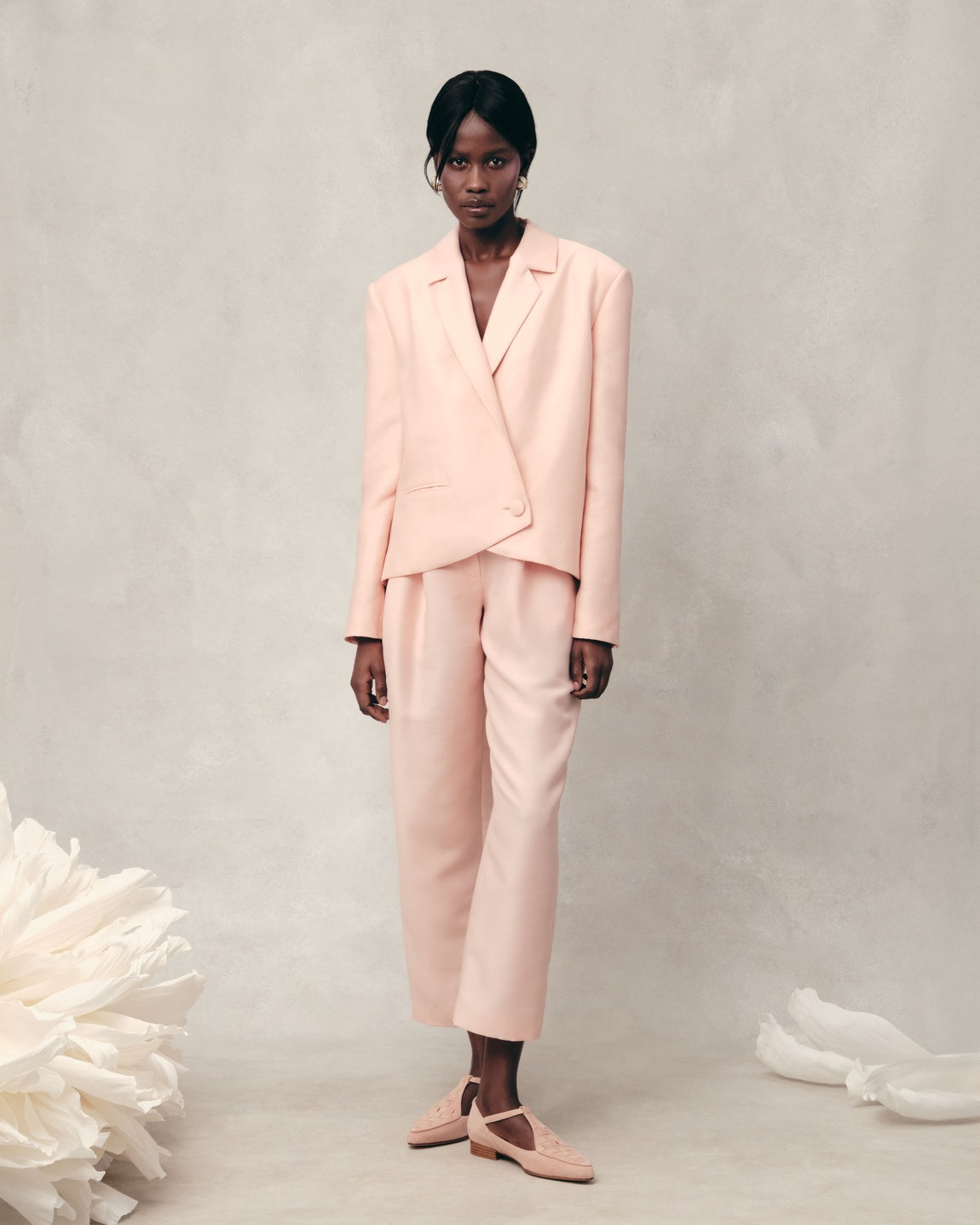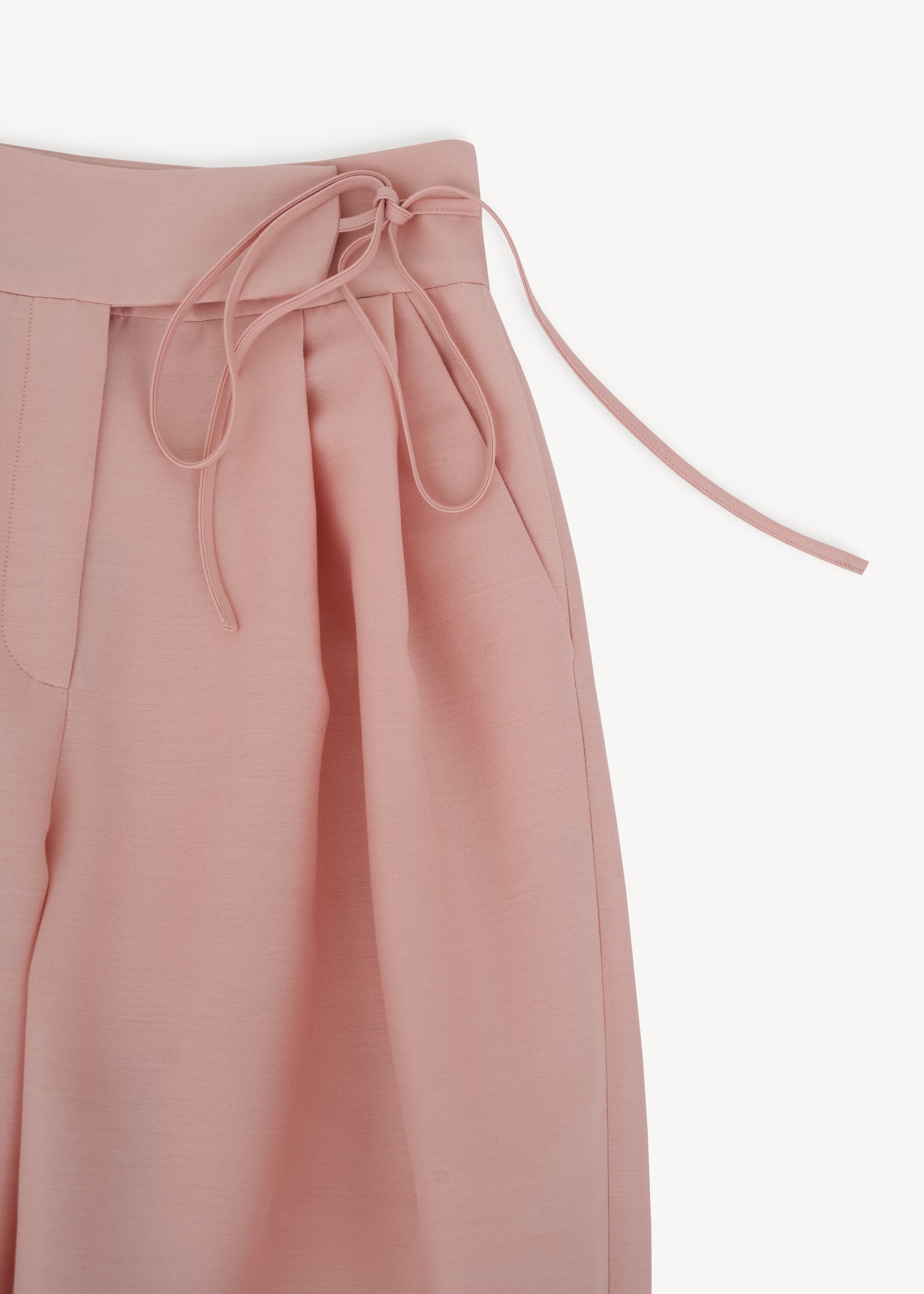 Elegant banana trousers of a loose fit with a high waist, pinches and ties in a delicate pink shade.