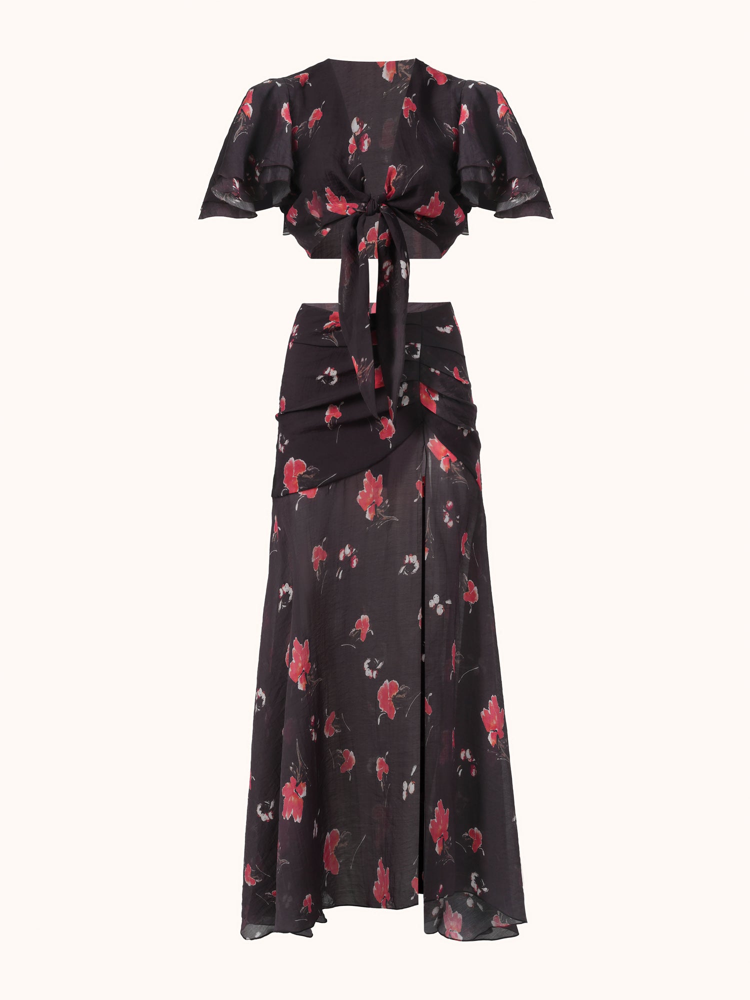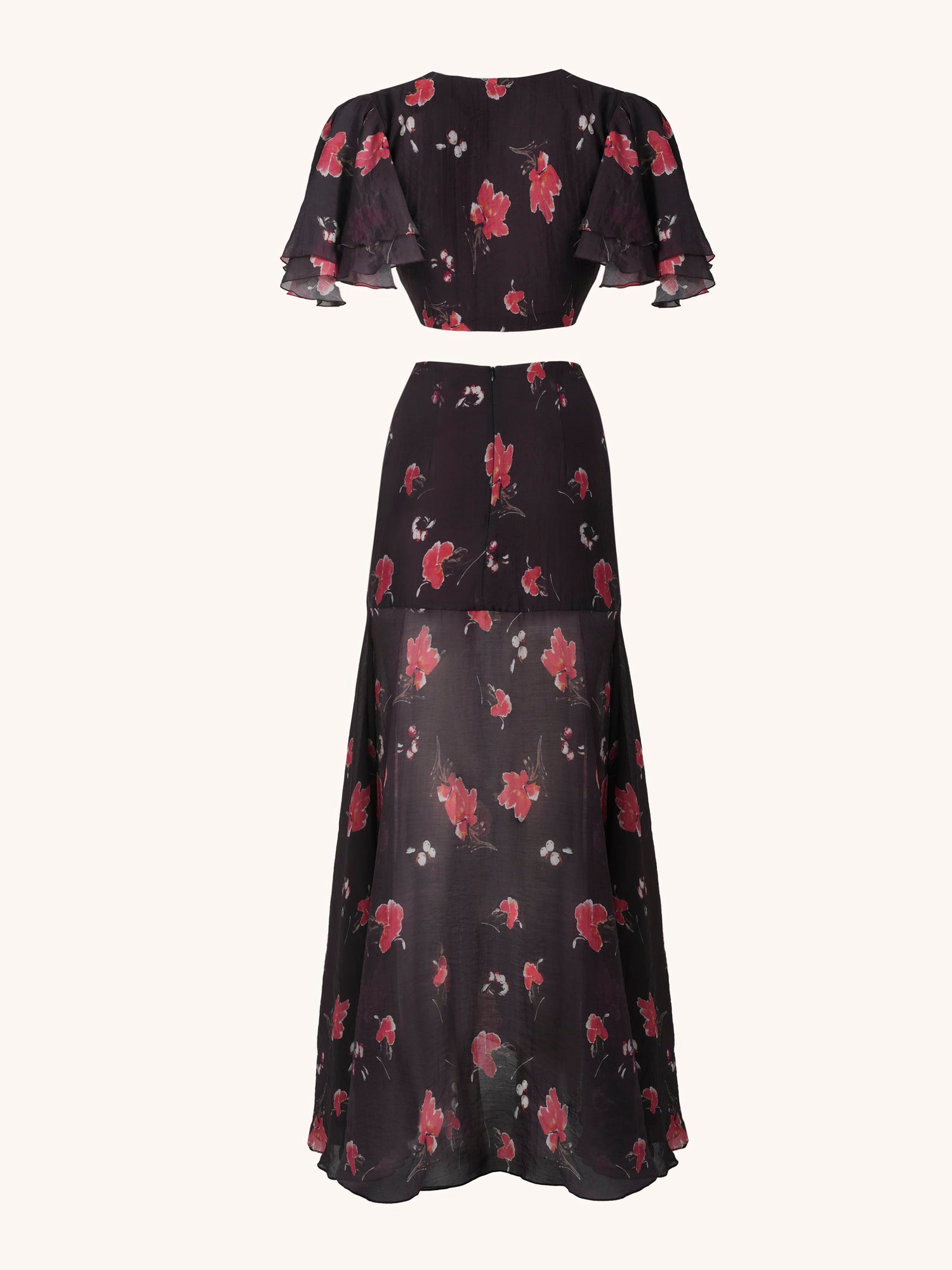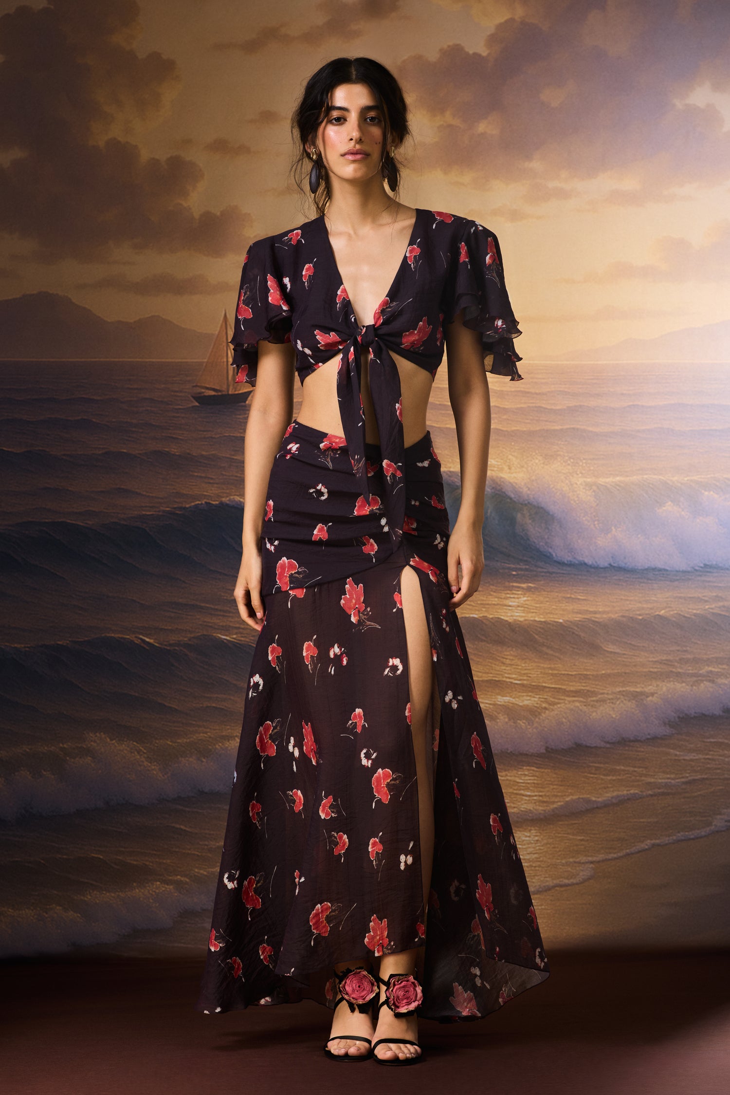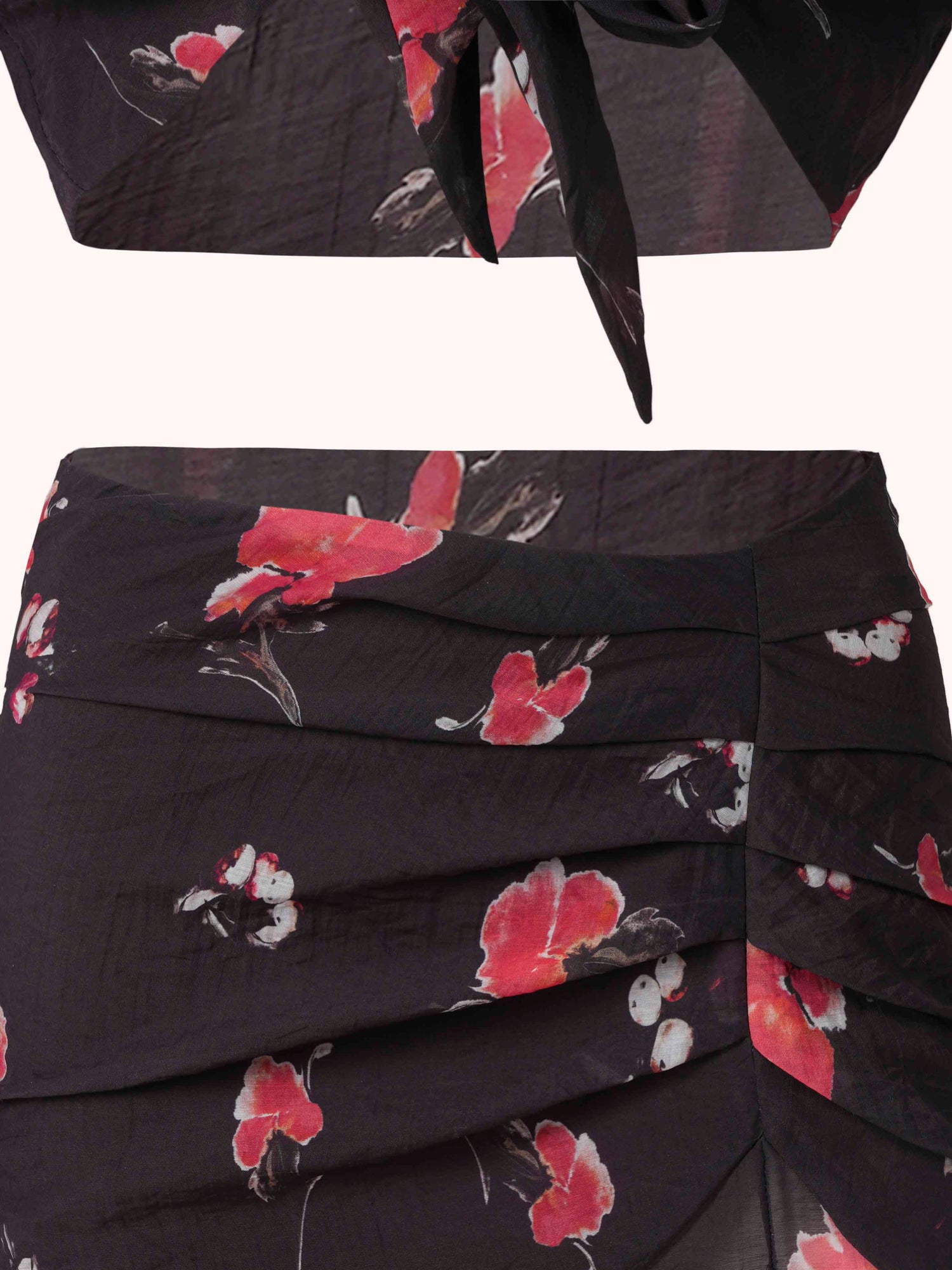 A natural silk suit consisting of a tie-top and a skirt with draping and a slit.