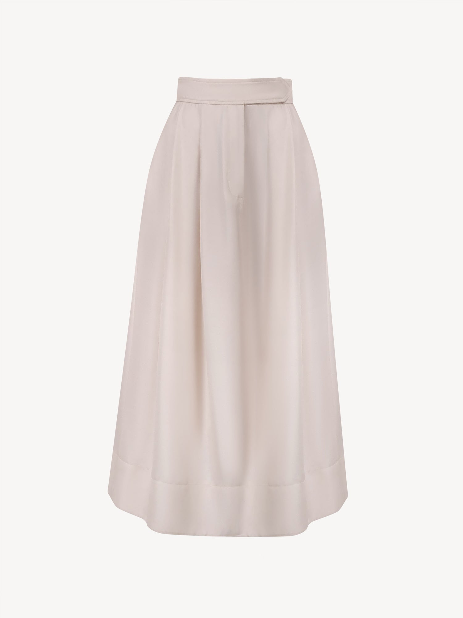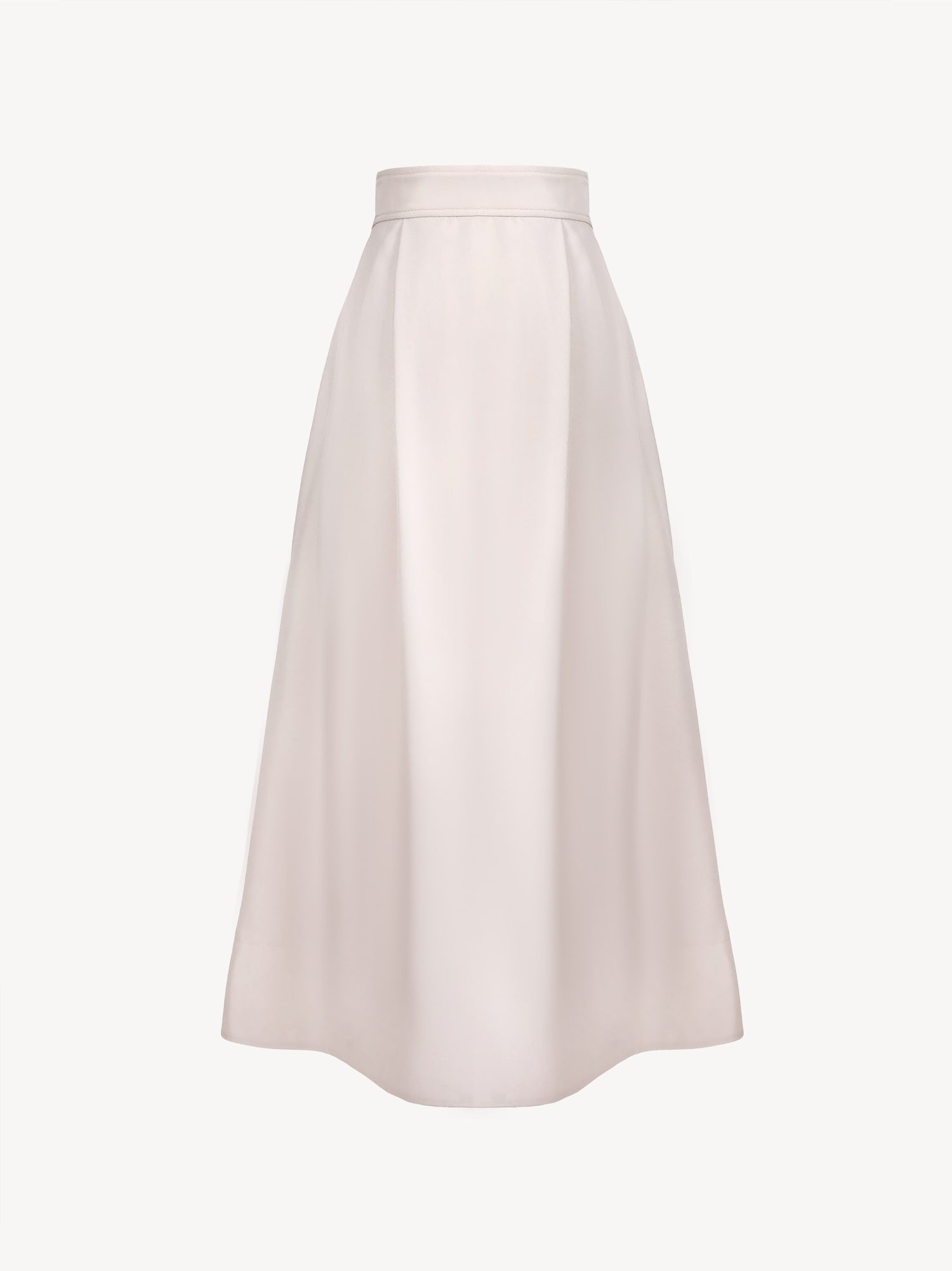 A midi-length A-line skirt with a waist fit and a zipper closure.
