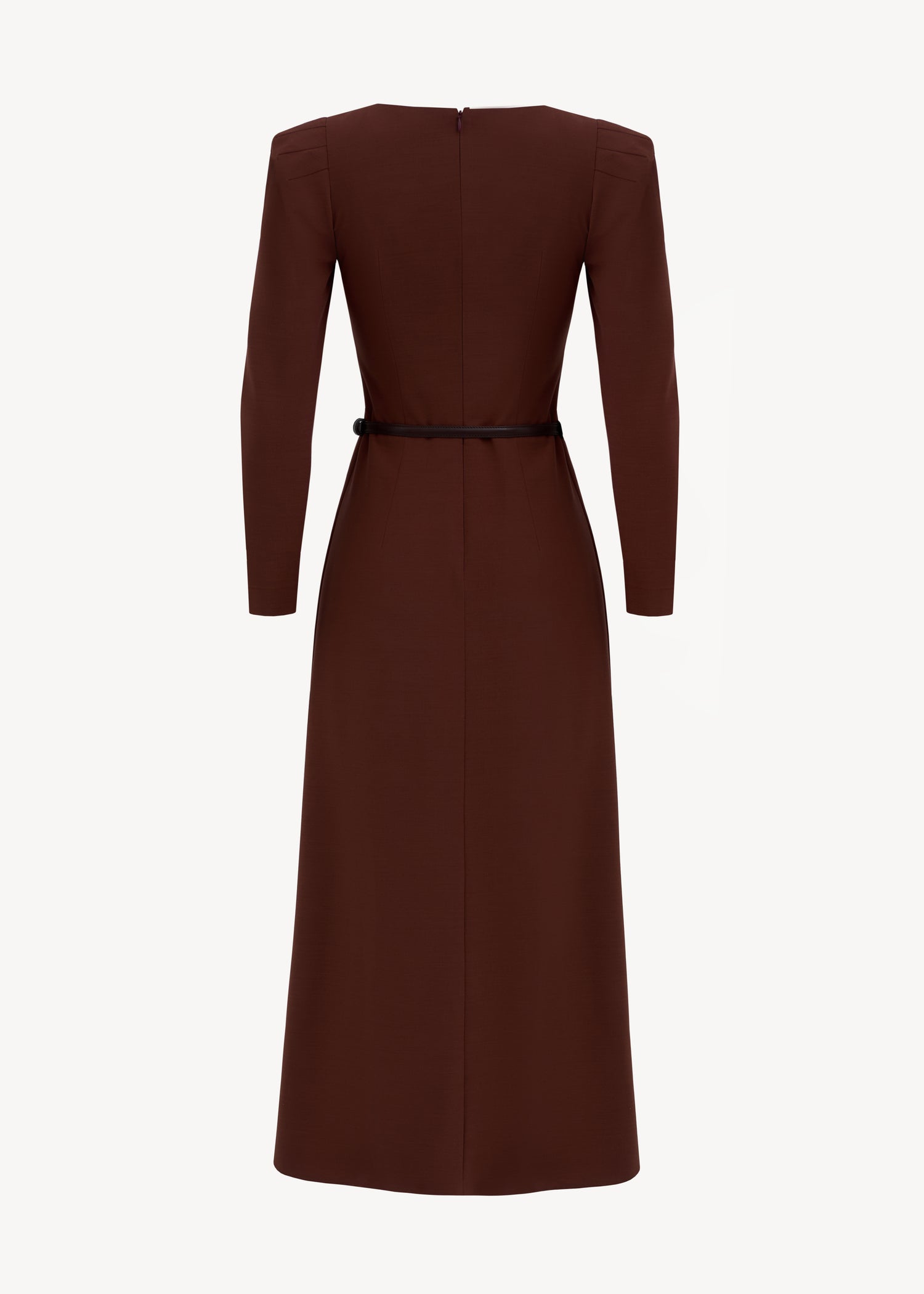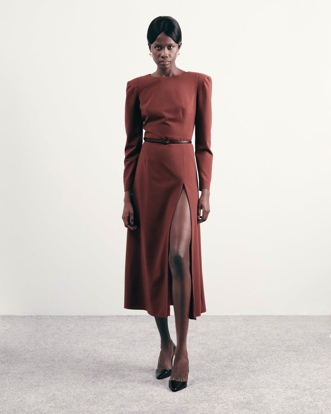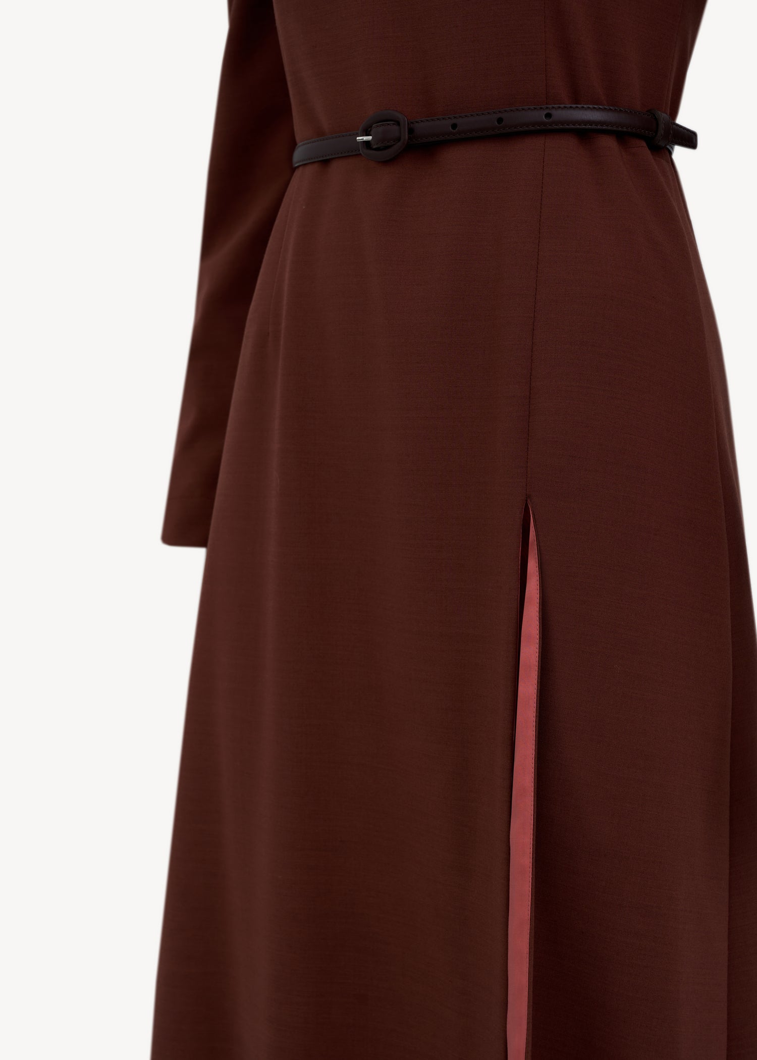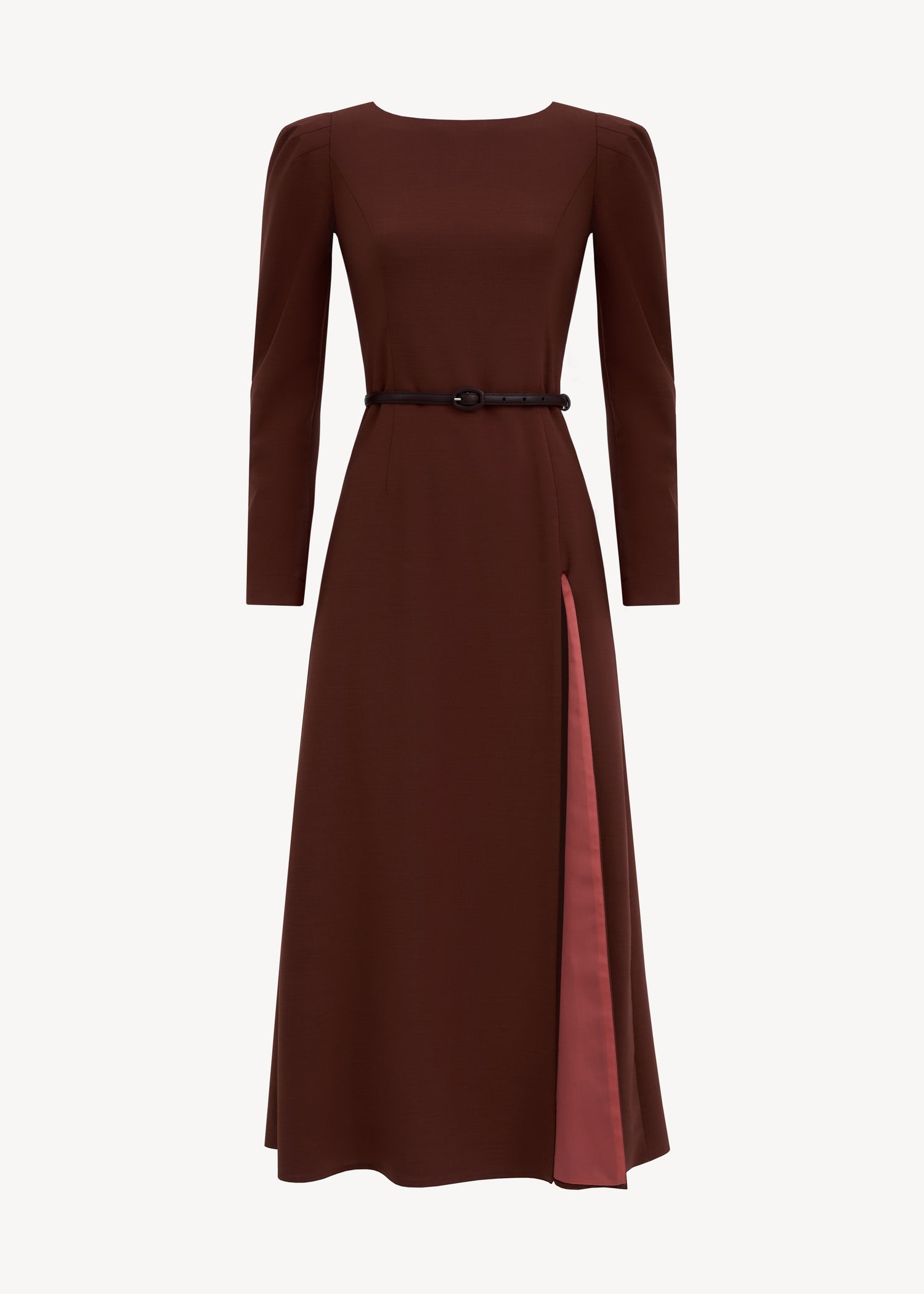 Midi dress with long sleeves, accent shoulders and a leather belt included. The fitted silhouette is complemented by a skirt with a high slit and contrasting lining.
