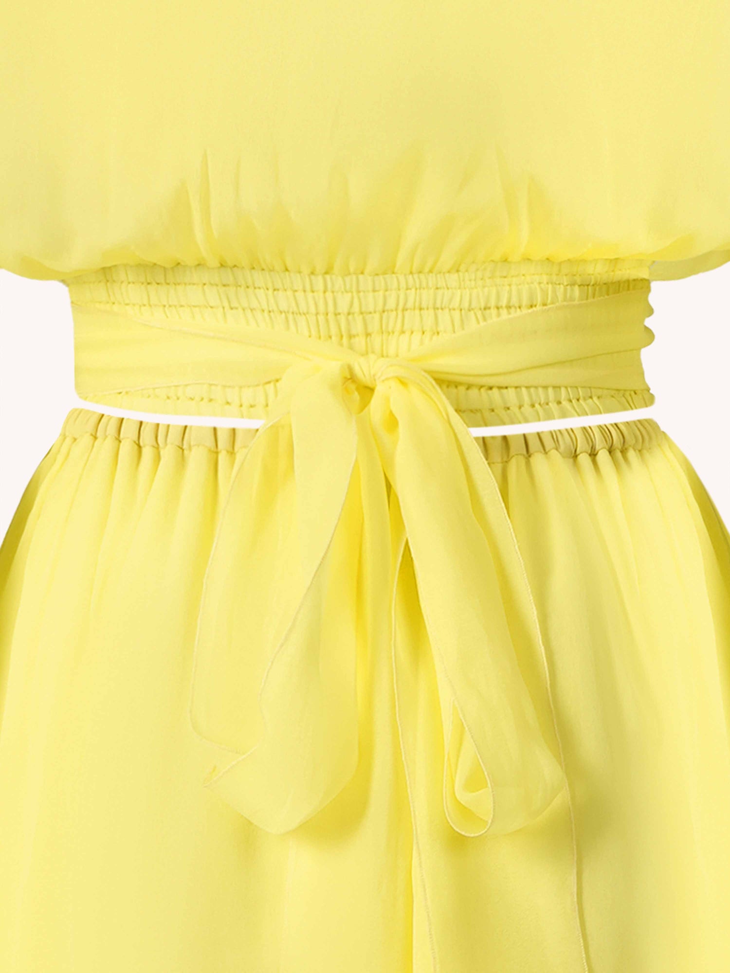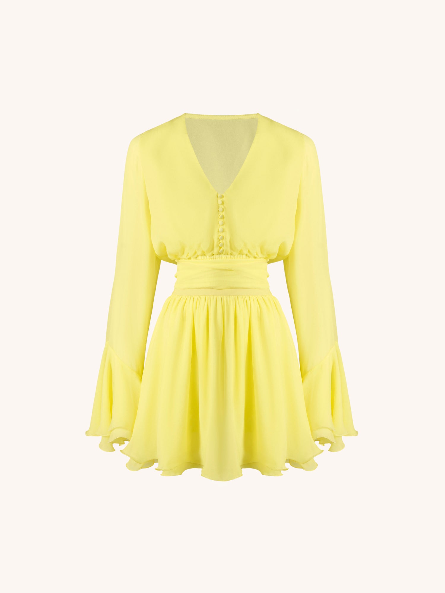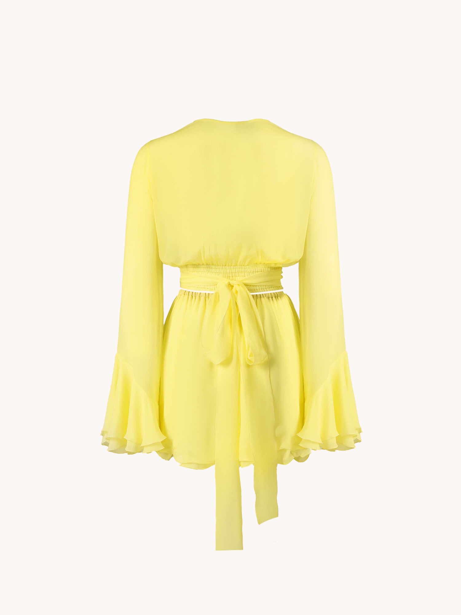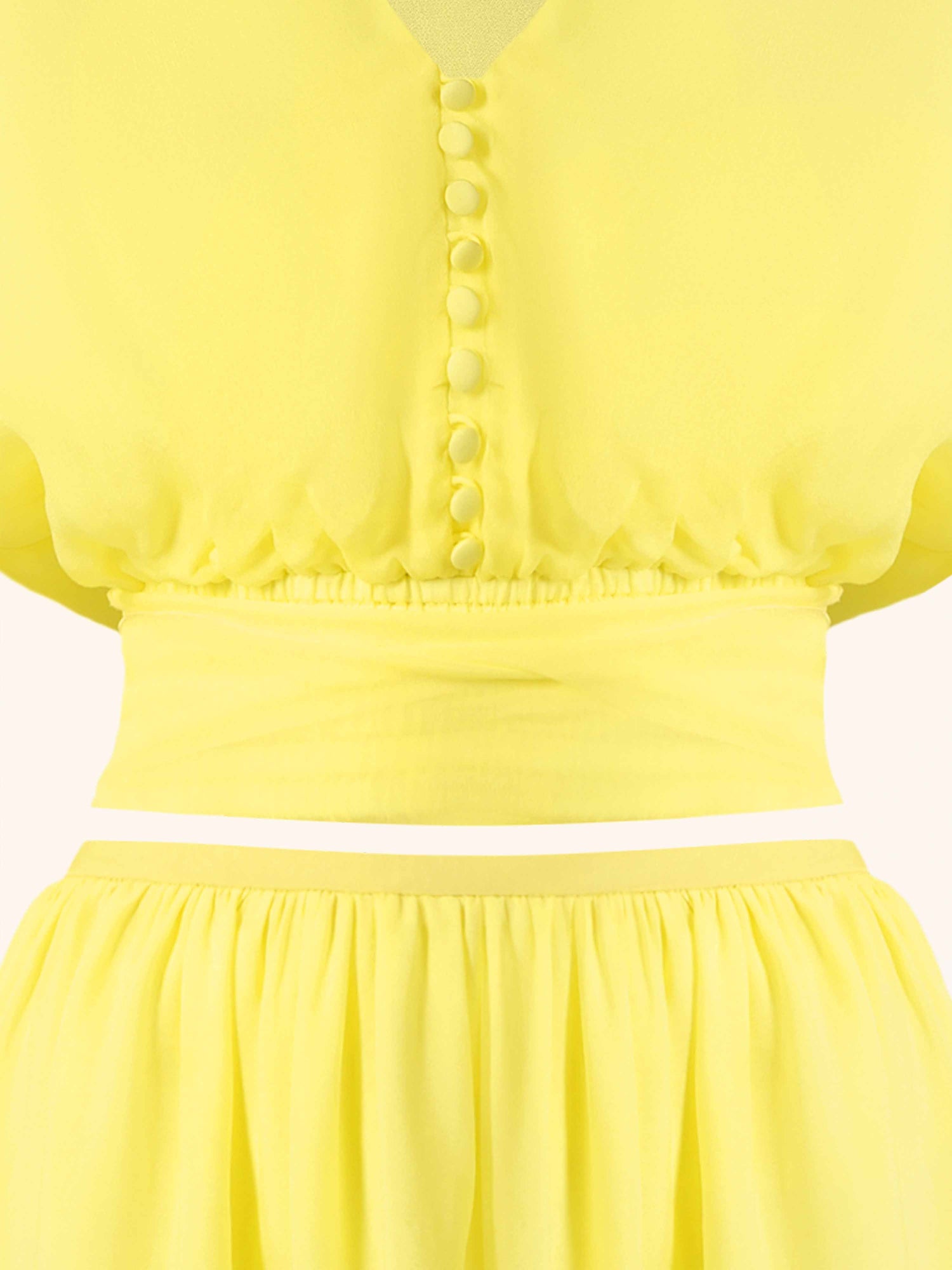 A flowing fabric suit consisting of two elements: a top with voluminous ruffled sleeves and a flared mini skirt with an elastic waistband.