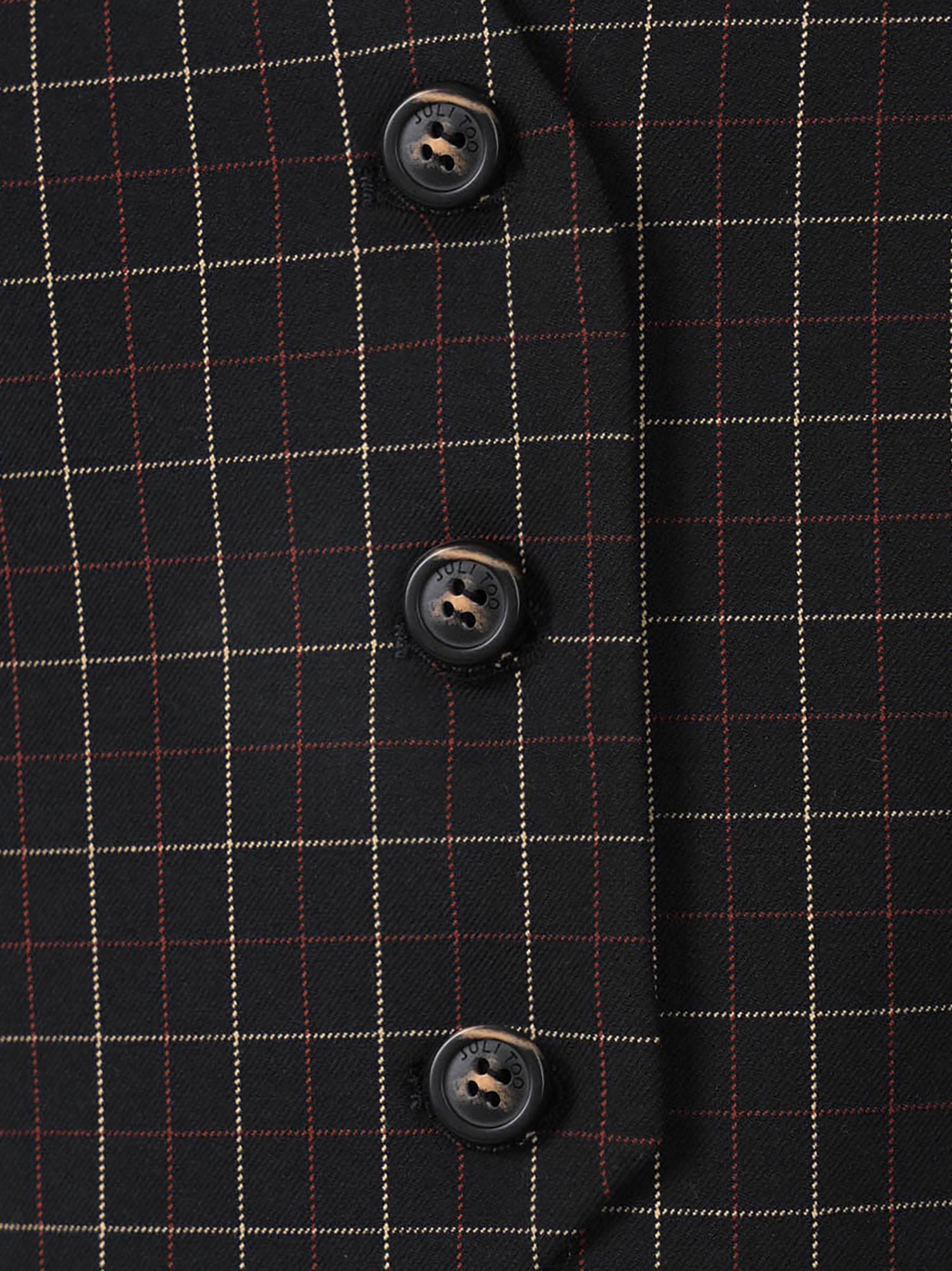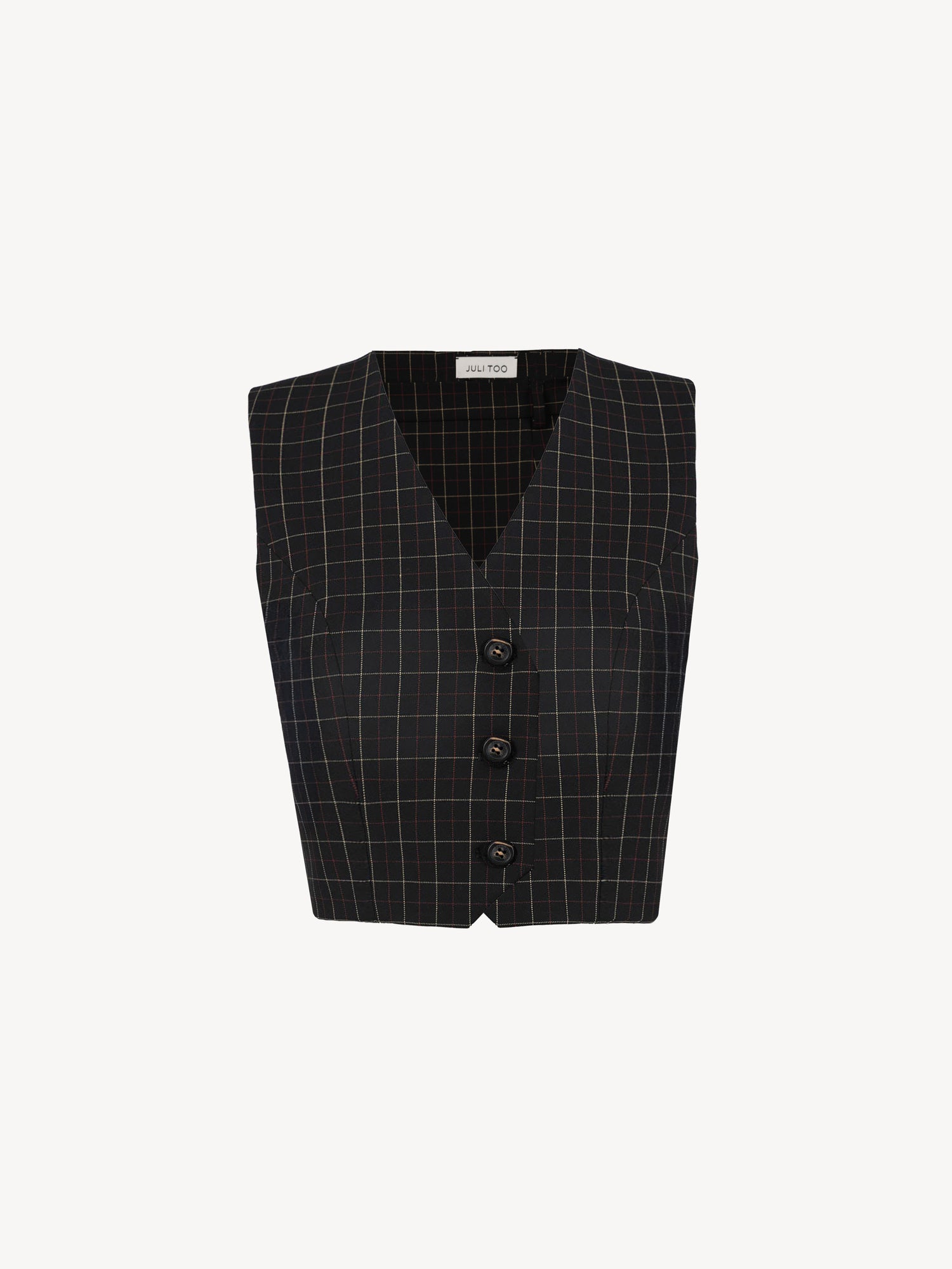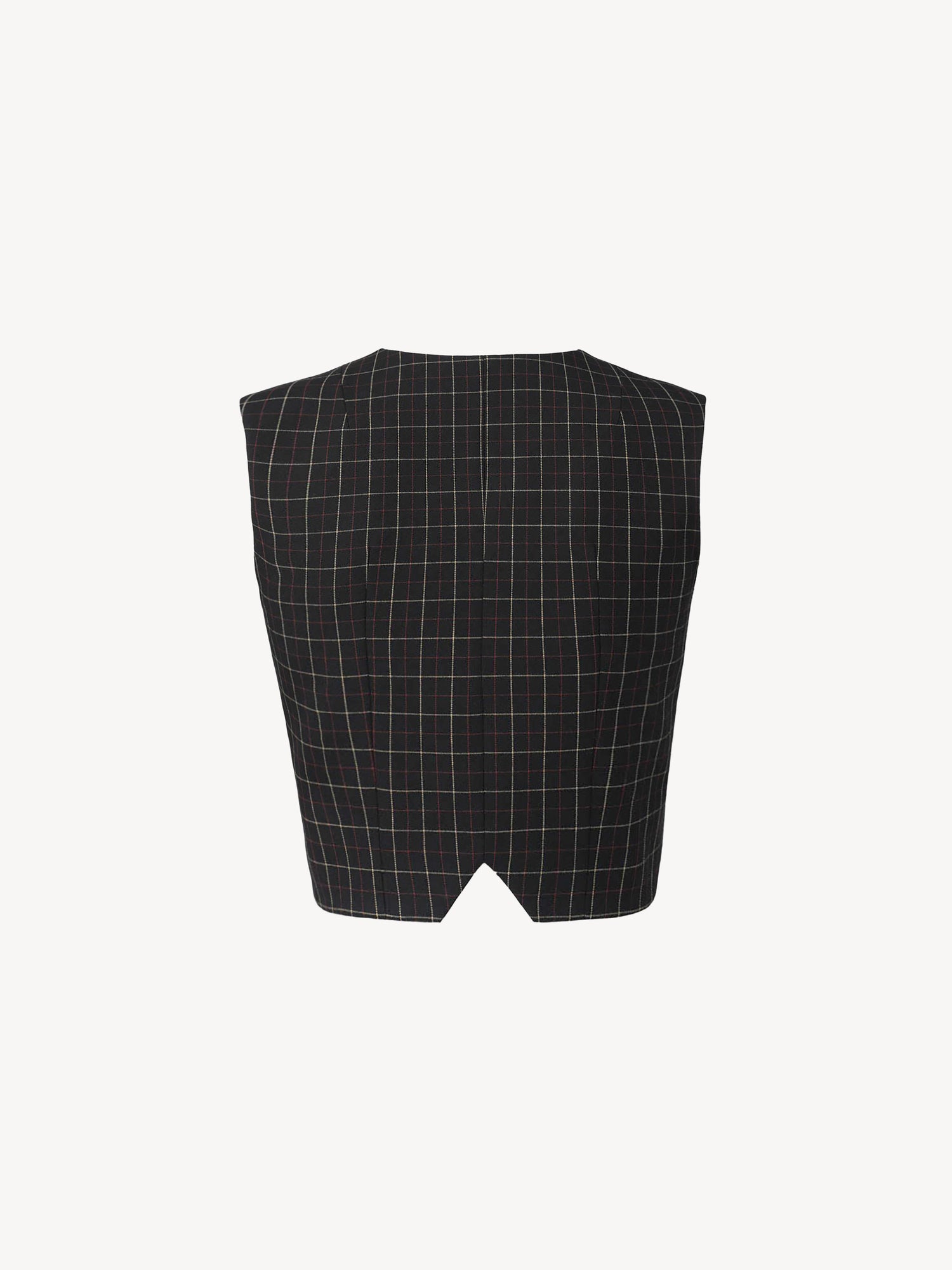 Cropped wool vest, fitted silhouette with V-neck, fastened with branded buttons.