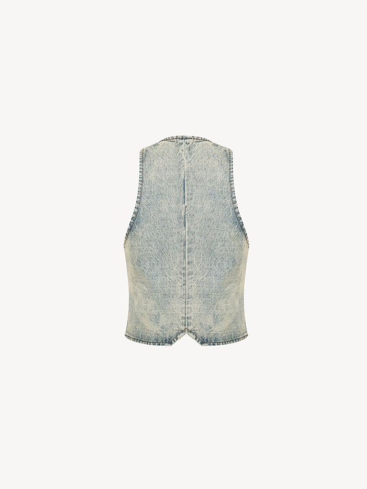 A fitted silhouette vest made of heavy denim, featuring pockets and branded hardware