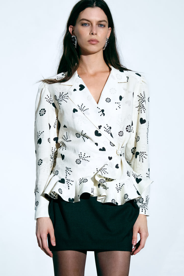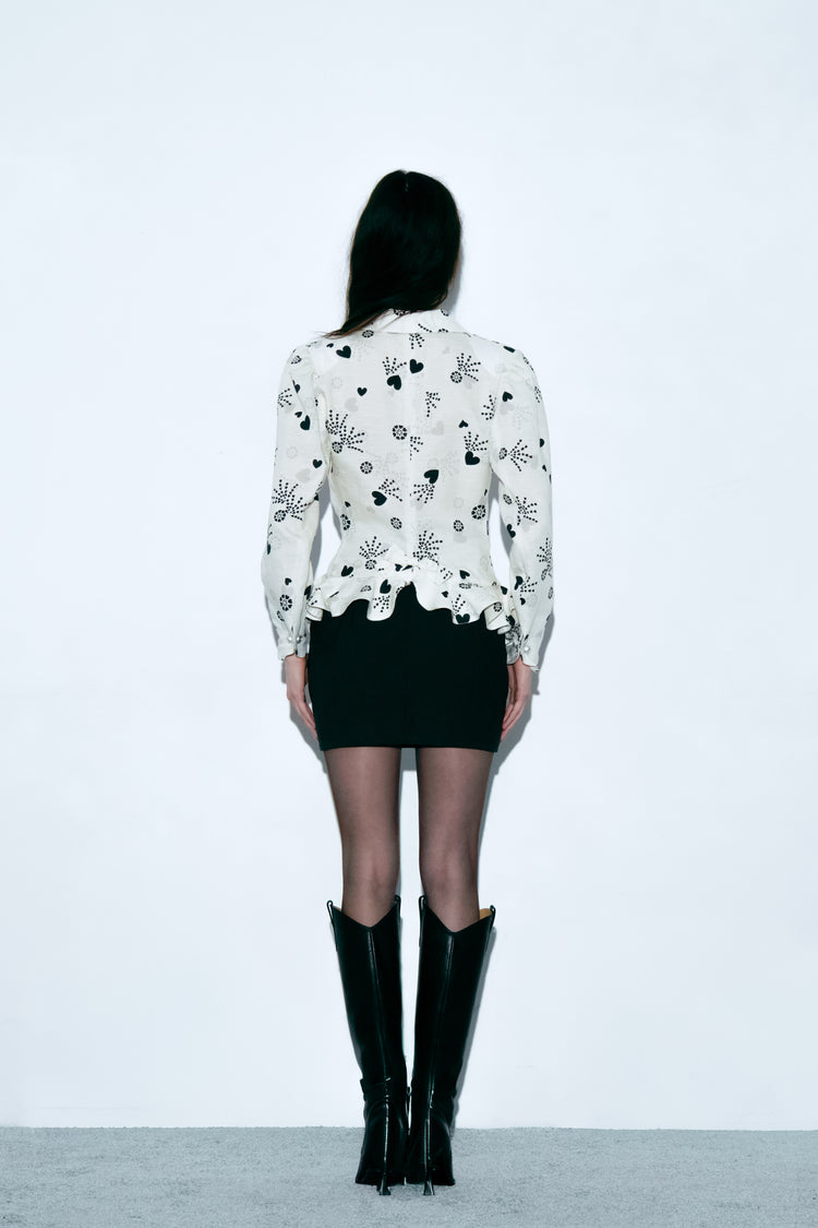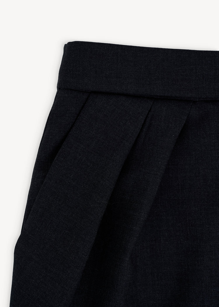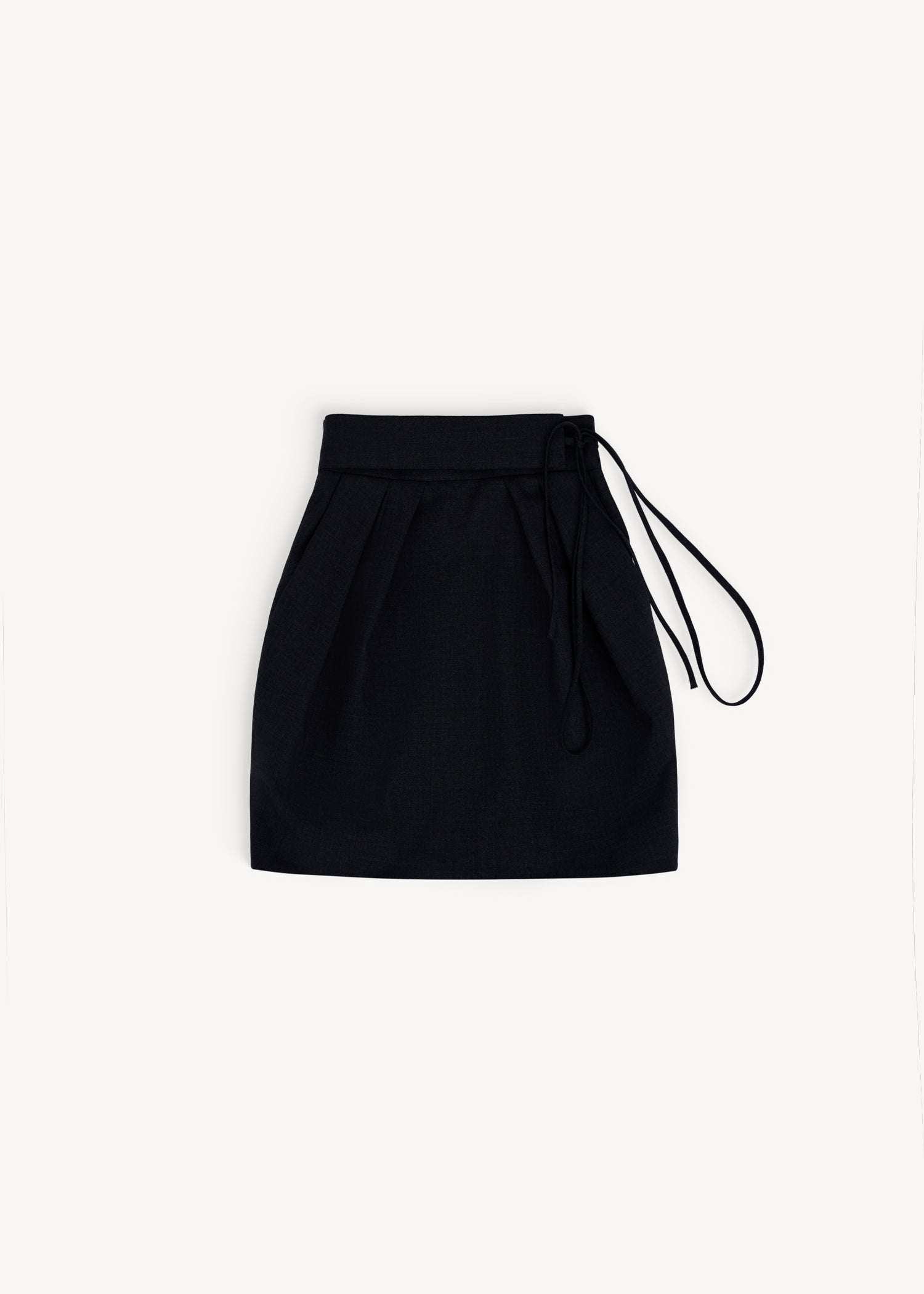 A voluminous mini skirt with a high waist, complemented by decorative ties on the waistband.
